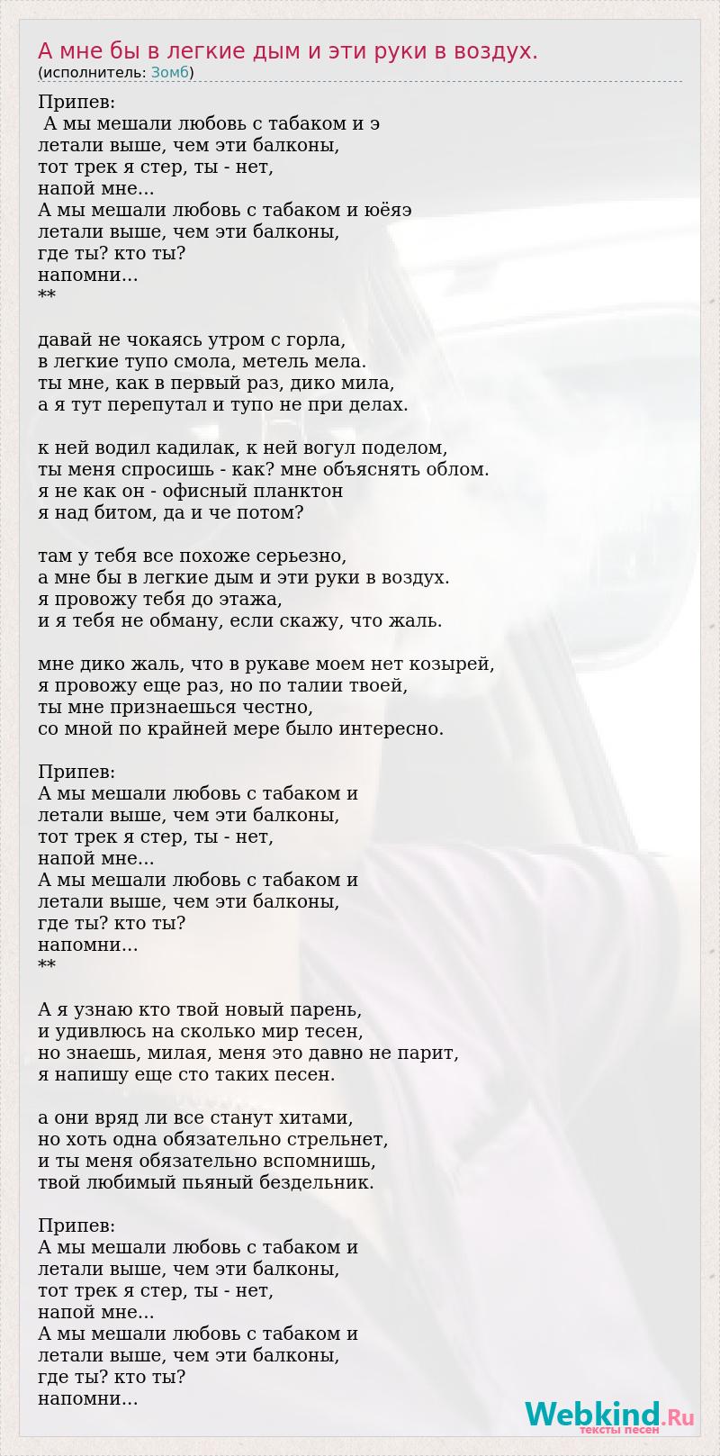 Припев: А мы мешали любовь с табаком и э летали выше, чем эти балконы, тот трек я стер, ты - нет, напой мне... А мы мешали любовь с табаком и юёяэ летали выше, чем эти балконы, где ты? кто ты? напомни... ** давай не чокаясь утром с горла, в легкие тупо смола, метель мела. ты мне, как в первый раз, дико мила, а я тут перепутал и тупо не при делах. к ней водил кадилак, к ней вогул поделом, ты меня спросишь - как? мне объяснять облом. я не как он - офисный планктон я над битом, да и че потом? там у тебя все похоже серьезно, а мне бы в легкие дым и эти руки в воздух. я провожу тебя до этажа, и я тебя не обману, если скажу, что жаль. мне дико жаль, что в рукаве моем нет козырей, я провожу еще раз, но по талии твоей, ты мне признаешься честно, со мной по крайней мере было интересно. Припев: А мы мешали любовь с табаком и летали выше, чем эти балконы, тот трек я стер, ты - нет, напой мне... А мы мешали любовь с табаком и летали выше, чем эти балконы, где ты? кто ты? напомни... ** А я узнаю кто твой новый парень, и удивлюсь на сколько мир тесен, но знаешь, милая, меня это давно не парит, я напишу еще сто таких песен. а они вряд ли все станут хитами, но хоть одна обязательно стрельнет, и ты меня обязательно вспомнишь, твой любимый пьяный бездельник. Припев: А мы мешали любовь с табаком и летали выше, чем эти балконы, тот трек я стер, ты - нет, напой мне... А мы мешали любовь с табаком и летали выше, чем эти балконы, где ты? кто ты? напомни...