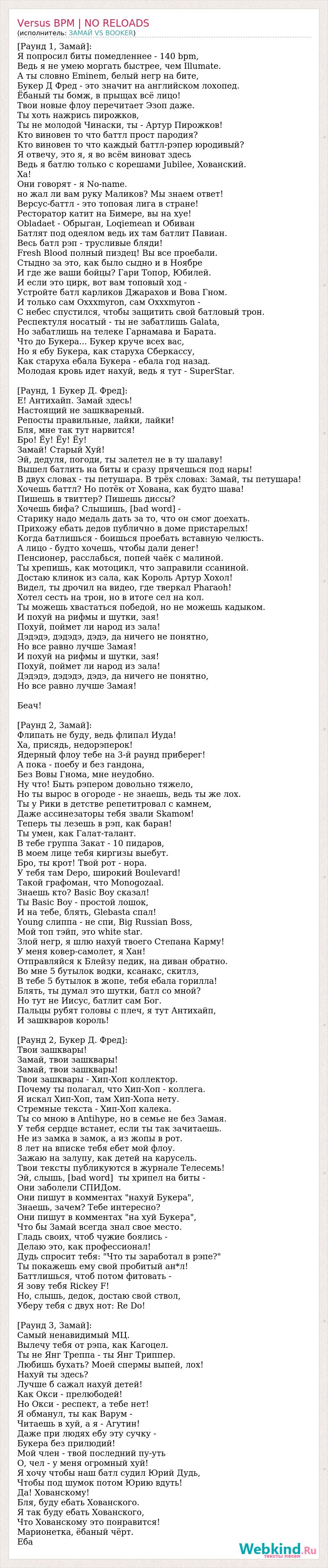 [Раунд 1, Замай]: Я попросил биты помедленнее - 140 bpm, Ведь я не умею моргать быстрее, чем Illumate. А ты словно Eminem, белый негр на бите, Букер Д Фред - это значит на английском лохопед. Ёбаный ты бомж, в прыщах всё лицо! Твои новые флоу перечитает Эзоп даже. Ты хоть нажрись пирожков, Ты не молодой Чинаски, ты - Артур Пирожков! Кто виновен то что баттл прост пародия? Кто виновен то что каждый баттл-рэпер юродивый? Я отвечу, это я, я во всём виноват здесь Ведь я батлю только с корешами Jubilee, Хованский. Ха! Они говорят - я No-name. но жал ли вам руку Маликов? Мы знаем ответ! Версус-баттл - это топовая лига в стране! Ресторатор катит на Бимере, вы на хуе! Obladaet - Обрыган, Loqiemean и Обиван Батлят под одеялом ведь их там батлит Павиан. Весь батл рэп - трусливые бляди! Fresh Blood полный пиздец! Вы все проебали. Стыдно за это, как было сыдно и в Ноябре И где же ваши бойцы? Гари Топор, Юбилей. И если это цирк, вот вам топовый ход - Устройте батл карликов Джарахов и Вова Гном. И только cам Oxxxmyron, сам Oxxxmyron - С небес спустился, чтобы защитить свой батловый трон. Респектуля носатый - ты не забатлишь Galata, Но забатлишь на телеке Гарнамава и Барата. Что до Букера... Букер круче всех вас, Но я ебу Букера, как старуха Сберкассу, Как старуха ебала Букера - ебала год назад. Молодая кровь идет нахуй, ведь я тут - SuperStar. [Раунд, 1 Букер Д. Фред]: Е! Антихайп. Замай здесь! Настоящий не зашквареный. Репосты правильные, лайки, лайки! Бля, мне так тут нарвится! Бро! Ёу! Ёу! Ёу! Замай! Старый Хуй! Эй, дедуля, погоди, ты залетел не в ту шалаву! Вышел батлить на биты и сразу прячешься под нары! В двух словах - ты петушара. В трёх словах: Замай, ты петушара! Хочешь баттл? Но потёк от Хована, как будто шава! Пишешь в твиттер? Пишешь диссы? Хочешь бифа? Слышишь, [bad word] - Старику надо медаль дать за то, что он смог доехать. Прихожу ебать дедов публично в доме пристарелых! Когда батлишься - боишься проебать вставную челюсть. А лицо - будто хочешь, чтобы дали денег! Пенсионер, расслабься, попей чаёк с малиной. Ты хрепишь, как мотоцикл, что заправили ссаниной. Достаю клинок из сала, как Король Артур Хохол! Видел, ты дрочил на видео, где тверкал Pharaoh! Хотел сесть на трон, но в итоге сел на кол. Ты можешь хвастаться победой, но не можешь кадыком. И похуй на рифмы и шутки, зая! Похуй, поймет ли народ из зала! Дэдэдэ, дэдэдэ, дэдэ, да ничего не понятно, Но все равно лучше Замая! И похуй на рифмы и шутки, зая! Похуй, поймет ли народ из зала! Дэдэдэ, дэдэдэ, дэдэ, да ничего не понятно, Но все равно лучше Замая! Беач! [Раунд 2, Замай]: Флипать не буду, ведь флипал Иуда! Ха, присядь, недорэперок! Ядерный флоу тебе на 3-й раунд приберег! А пока - поебу и без гандона, Без Вовы Гнома, мне неудобно. Ну что! Быть рэпером довольно тяжело, Но ты вырос в огороде - не знаешь, ведь ты же лох. Ты у Рики в детстве репетитровал с камнем, Даже ассинезаторы тебя звали Skamом! Теперь ты лезешь в рэп, как баран! Ты умен, как Галат-талант. В тебе группа Закат - 10 пидаров, В моем лице тебя киргизы выебут. Бро, ты крот! Твой рот - нора. У тебя там Depo, широкий Boulevard! Такой графоман, что Monogozaal. Знаешь кто? Basic Boy сказал! Ты Basic Boy - простой лошок, И на тебе, блять, Glebasta спал! Young слиппа - не спи, Big Russian Boss, Мой топ тэйп, это white star. Злой негр, я шлю нахуй твоего Степана Карму! У меня ковер-самолет, я Хан! Отправляйся к Блейзу педик, на диван обратно. Во мне 5 бутылок водки, ксанакс, скитлз, В тебе 5 бутылок в жопе, тебя ебала горилла! Блять, т