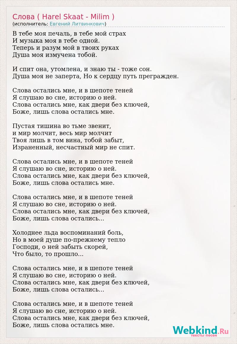 В тебе моя печаль, в тебе мой страх И музыка моя в тебе одной. Теперь и разум мой в твоих руках Душа моя измучена тобой. И спит она, утомлена, и знаю ты - тоже сон. Душа моя не заперта, Но к сердцу путь прегражден. Слова остались мне, и в шепоте теней Я слушаю во сне, историю о ней. Слова остались мне, как двери без ключей, Боже, лишь слова остались мне. Пустая тишина во тьме звенит, и мир молчит, весь мир молчит Твоя лишь в том вина, тобой забыт, Израненный, несчастный мир не спит. Слова остались мне, и в шепоте теней Я слушаю во сне, историю о ней. Слова остались мне, как двери без ключей, Боже, лишь слова остались мне. Слова остались мне, и в шепоте теней Я слушаю во сне, историю о ней. Слова остались мне, как двери без ключей, Боже, лишь слова остались... Холоднее льда воспоминаний боль, Но в моей душе по-прежнему тепло Господи, о ней забыть скорей, Что было, то прошло... Слова остались мне, и в шепоте теней Я слушаю во сне, историю о ней. Слова остались мне, как двери без ключей, Боже, лишь слова остались... Слова остались мне, и в шепоте теней Я слушаю во сне, историю о ней. Слова остались мне, как двери без ключей, Боже, лишь слова остались мне.
