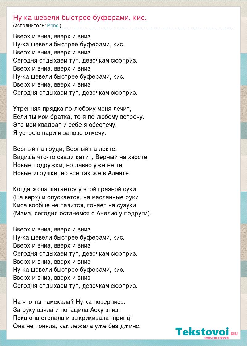 Вверх и вниз, вверх и вниз Ну-ка шевели быстрее буферами, кис. Вверх и вниз, вверх и вниз Сегодня отдыхаем тут, девочкам сюрприз. Вверх и вниз, вверх и вниз Ну-ка шевели быстрее буферами, кис. Вверх и вниз, вверх и вниз Сегодня отдыхаем тут, девочкам сюрприз. Утренняя прядка по-любому меня лечит, Если ты мой братка, то я по-любому встречу. Это мой квадрат и себе я обеспечу, Я устрою пари и заново отмечу. Верный на груди, Верный на локте. Видишь что-то сзади катит, Верный на хвосте Новые подружки, но давно уже не те Новые игрушки, но все так же в Алмате. Когда жопа шатается у этой грязной суки (На верх) и опускается, на маслянные руки Киса вообще не палится, гоняет на сузуки (Мама, сегодня останемся с Анелио у подруги). Вверх и вниз, вверх и вниз Ну-ка шевели быстрее буферами, кис. Вверх и вниз, вверх и вниз Сегодня отдыхаем тут, девочкам сюрприз. Вверх и вниз, вверх и вниз Ну-ка шевели быстрее буферами, кис. Вверх и вниз, вверх и вниз Сегодня отдыхаем тут, девочкам сюрприз. На что ты намекала? Ну-ка повернись. За руку взяла и потащила Асху вниз, Пока она стонала и выкрикивала "принц" Она не поняла, как лежала уже без джинс.