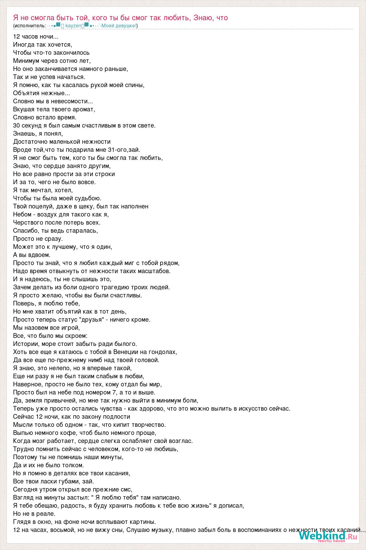 12 часов ночи... Иногда так хочется, Чтобы что-то закончилось Минимум через сотню лет, Но оно заканчивается намного раньше, Так и не успев начаться. Я помню, как ты касалась рукой моей спины, Объятия нежные... Словно мы в невесомости... Вкушая тела твоего аромат, Словно встало время. 30 секунд я был самым счастливым в этом свете. Знаешь, я понял, Достаточно маленькой нежности Вроде той,что ты подарила мне 31-ого,зай. Я не смог быть тем, кого ты бы смогла так любить, Знаю, что сердце занято другим, Но все равно прости за эти строки И за то, чего не было вовсе. Я так мечтал, хотел, Чтобы ты была моей судьбою. Твой поцелуй, даже в щеку, был так наполнен Небом - воздух для такого как я, Черствого после потерь всех. Спасибо, ты ведь старалась, Просто не сразу. Может это к лучшему, что я один, А вы вдвоем. Просто ты знай, что я любил каждый миг с тобой рядом, Надо время отвыкнуть от нежности таких масштабов. И я надеюсь, ты не слышишь это, Зачем делать из боли одного трагедию троих людей. Я просто желаю, чтобы вы были счастливы. Поверь, я люблю тебе, Но мне хватит объятий как в тот день, Просто теперь статус "друзья" - ничего кроме. Мы назовем все игрой, Все, что было мы скроем: Истории, море стоит забыть ради былого. Хоть все еще я катаюсь с тобой в Венеции на гондолах, Да все еще по-прежнему нимб над твоей головой. Я знаю, это нелепо, но я впервые такой, Еще ни разу я не был таким слабым в любви, Наверное, просто не было тех, кому отдал бы мир, Просто был на небе под номером 7, а то и выше. Да, земля привычней, но мне так нужно выйти в минимум боли, Теперь уже просто остались чувства - как здорово, что это можно вылить в искусство сейчас. Сейчас 12 ночи, как по закону подлости Мысли только об одном - так, что кипит творчество. Выпью немного кофе, чтоб было немного проще, Когда мозг работает, сердце слегка ослабляет свой возглас. Трудно помнить сейчас с человеком, кого-то не любишь, Поэтому ты не помнишь наши минуты, Да и их не было толком. Но я помню в деталях все твои касания, Все твои ласки губами, зай. Сегодня утром открыл все прежние смс, Взгляд на минуты застыл: " Я люблю тебя" там написано. Я тебе обещаю, радость, я буду хранить любовь к тебе всю жизнь" я дописал, Но не в реале. Глядя в окно, на фоне ночи всплывают картины. 12 на часах, восьмой, но не вижу сны, Слушаю музыку, плавно забыл боль в воспоминаниях о нежности твоих касаний...