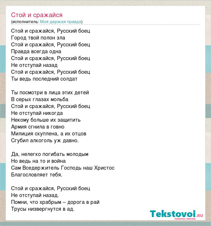 Стой и сражайся, Русский боец Город твой полон зла Стой и сражайся, Русский боец Правда всегда одна Стой и сражайся, Русский боец Не отступай назад Стой и сражайся, Русский боец Ты ведь последний солдат Ты посмотри в лица этих детей В серых глазах мольба Стой и сражайся, Русский боец Не отступай никогда Некому больше их защитить Армия сгнила в говно Милиция скуплена, а их отцов Сгубил алкоголь уж давно. Да, нелегко погибать молодым Но ведь на то и война Сам Вседержитель Господь наш Христос Благословляет тебя. Стой и сражайся, Русский боец Не отступай назад. Помни, что храбрым – дорога в рай Трусы низвергнутся в ад.