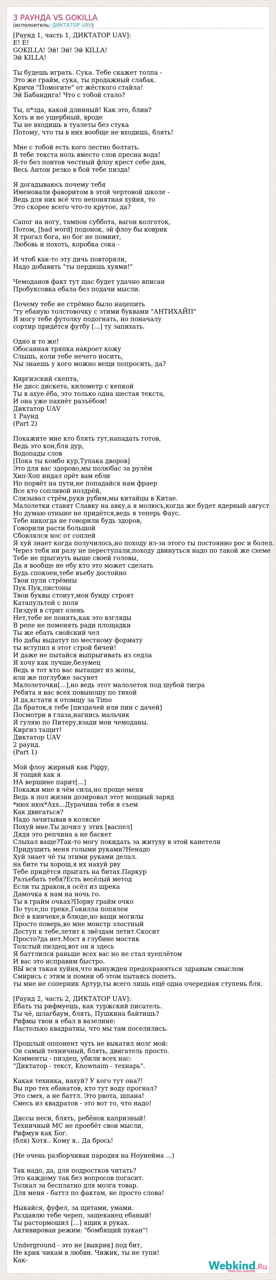 [Раунд 1, часть 1, ДИКТАТОР UAV]: Е! Е! GOKILLA! Эй! Эй! Эй KILLA! Эй KILLA! Ты будешь играть. Сука. Тебе скажет толпа - Это же грайм, сука, ты продажный слабак. Кричи "Помогите" от жёсткого стайла! Эй Бабандига! Что с тобой стало? Ты, п*зда, какой длинный! Как это, блин? Хоть и не ущербный, вроде Ты не входишь в туалеты без стука Потому, что ты в них вообще не входишь, блять! Мне с тобой есть кого лестно болтать. В тебе текста ноль вместо слов пресна вода! Я-то без понтов честный флоу крест себе дам, Весь Антон резко в бой тебе пизда! Я догадываюсь почему тебя Именовали фаворитом в этой чертовой школе - Ведь для них всё что непонятная хуйня, то Это скорее всего что-то крутое, да? Сапог на ногу, тампон суббота, вагон колготок, Потом, [bad word] подонок, эй флоу бы коврик Я трогал бога, но бог не помнит, Любовь и похоть, коробка сока - И чтоб как-то эту дичь повторяли, Надо добавить "ты пердишь хуями!" Чемоданов факт тут щас будет удачно вписан Пробуксовка ебала без подачи мысли. Почему тебе не стрёмно было нацепить "ту ебаную толстовочку с этими буквами "АНТИХАЙП" Я могу тебе футолку подогнать, но поначалу сортир придётся футбу [...] ту запихать. Одно и то же! Обосанная тряпка накроет кожу Слышь, коли тебе нечего носить, Nы знаешь у кого можно вещи попросить, да? Киргизский скепта, Не дисс дискета, километр с кепкой Ты в ахуе ёба, это только одна шестая текста, И она уже пахнёт разъёбом! Диктатор UAV 1 Раунд (Part 2) Покажите мне кто блять тут,нападать готов, Ведь это кон,бля дур, Водопады слов [Пока ты комбо кур,Тупака дворов] Это для вас здорово,мы полюбас за рулём Хип-Хоп индал орёт вам ебли Но порвёт на пути,не попадайся нам фраер Все кто сопливой ноздрёй, Слизывал стрём,руки рубим,мы китайцы в Китае. Малолетки ставят Славку на авку,а я молюсь,когда же будет ядерный август Но думаю отныне не придётся,ведь я теперь Фаус. Тебе никогда не говорили будь здоров, Говорили расти большой Сбовлялся нос от соплей Я хуй знает когда получилось,но походу из-за этого ты постоянно рос и болел. Через тебя ни разу не переступали,походу двинуться надо по такой же схеме Тебе не прыгнуть выше своей головы, Да я вообще не ебу кто это может сделать Будь спокоен,тебе въебу достойно Твои пули стрёмны Пук Пук,пистоны Твои буквы стонут,мои бунду строят Катапультой с поля Пиздуй в стрит олень Нет,тебе не понять,как это взгляды В репе не поменять ради площадки Ты же ебать свойский чел Но дабы выдатут по местному формату ты вступил в этот строй бичей! И даже не пытайся выпрыгивать из седла Я хочу как лучше,безумец Ведь я тот кто вас вытащит из жопы, или же поглубже засунет Малолеточки[...],но ведь этот малолеток под шубой тигра Ребята я вас всех повыношу по тихой И да,кстати я отомщу за Timo Да браток,я тебе [пиздачей или пин с дачей] Посмотри в глаза,нагнись мальчик Я гуляю по Питеру,взади мои чемоданы. Киргиз тащит! Диктатор UAV 2 раунд. (Part 1) Мой флоу жирный как Piggy, Я тощий как я НА вершине парит[...] Покажи мне в чём сила,но проще меня Ведь я пол жизни дозировал этот мощный заряд *нюх нюх*Ахх...Дурачина тебя я съем Как двигаться? Надо зачитывав в коляске Похуй мне.Ты дочил у этих [васпел] Дядя это репчина а не баскет Слыхал ваще?Так-то могу покидать за житуху в этой канетели Придушить меня голыми руками?Ненадо Хуй знает чё ты этими руками делал. на бите ты хорош,я их нахуй рву Тебе придётся прыгать на битах.Паркур Разъебать тебя?Есть весёлый ме