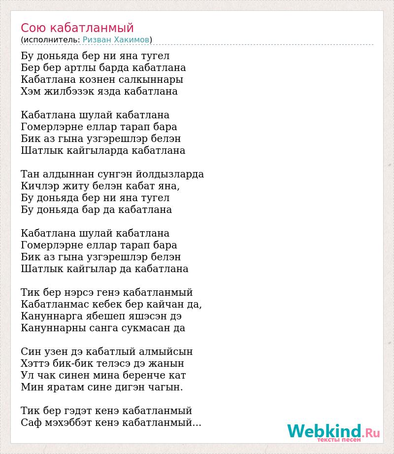 Бу доньяда бер ни яна тугел Бер бер артлы барда кабатлана Кабатлана кознен салкыннары Хэм жилбэзэк язда кабатлана Кабатлана шулай кабатлана Гомерлэрне еллар тарап бара Бик аз гына узгэрешлэр белэн Шатлык кайгыларда кабатлана Тан алдыннан сунгэн йолдызларда Кичлэр житу белэн кабат яна, Бу доньяда бер ни яна тугел Бу доньяда бар да кабатлана Кабатлана шулай кабатлана Гомерлэрне еллар тарап бара Бик аз гына узгэрешлэр белэн Шатлык кайгылар да кабатлана Тик бер нэрсэ генэ кабатланмый Кабатланмас кебек бер кайчан да, Кануннарга ябешеп яшэсэн дэ Кануннарны санга сукмасан да Син узен дэ кабатлый алмыйсын Хэттэ бик-бик телэсэ дэ жанын Ул чак синен мина беренче кат Мин яратам сине дигэн чагын. Тик бер гэдэт кенэ кабатланмый Саф мэхэббэт кенэ кабатланмый...