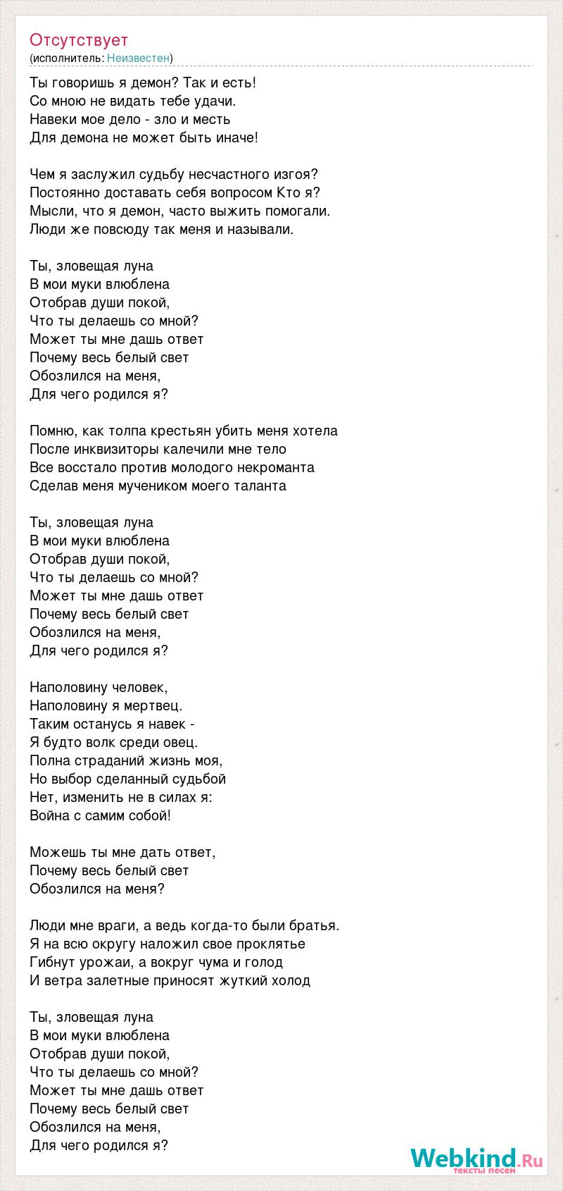 Ты говоришь я демон? Так и есть! Со мною не видать тебе удачи. Навеки мое дело - зло и месть Для демона не может быть иначе! Чем я заслужил судьбу несчастного изгоя? Постоянно доставать себя вопросом Кто я? Мысли, что я демон, часто выжить помогали. Люди же повсюду так меня и называли. Ты, зловещая луна В мои муки влюблена Отобрав души покой, Что ты делаешь со мной? Может ты мне дашь ответ Почему весь белый свет Обозлился на меня, Для чего родился я? Помню, как толпа крестьян убить меня хотела После инквизиторы калечили мне тело Все восстало против молодого некроманта Сделав меня мучеником моего таланта Ты, зловещая луна В мои муки влюблена Отобрав души покой, Что ты делаешь со мной? Может ты мне дашь ответ Почему весь белый свет Обозлился на меня, Для чего родился я? Наполовину человек, Наполовину я мертвец. Таким останусь я навек - Я будто волк среди овец. Полна страданий жизнь моя, Но выбор сделанный судьбой Нет, изменить не в силах я: Война с самим собой! Можешь ты мне дать ответ, Почему весь белый свет Обозлился на меня? Люди мне враги, а ведь когда-то были братья. Я на всю округу наложил свое проклятье Гибнут урожаи, а вокруг чума и голод И ветра залетные приносят жуткий холод Ты, зловещая луна В мои муки влюблена Отобрав души покой, Что ты делаешь со мной? Может ты мне дашь ответ Почему весь белый свет Обозлился на меня, Для чего родился я?