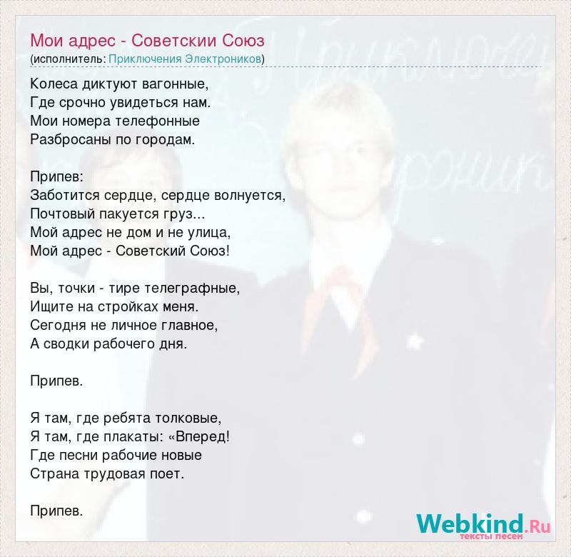 Колеса диктуют вагонные, Где срочно увидеться нам. Мои номера телефонные Разбросаны по городам. Припев: Заботится сердце, сердце волнуется, Почтовый пакуется груз... Мой адрес не дом и не улица, Мой адрес - Советский Союз! Вы, точки - тире телеграфные, Ищите на стройках меня. Сегодня не личное главное, А сводки рабочего дня. Припев. Я там, где ребята толковые, Я там, где плакаты: «Вперед! Где песни рабочие новые Страна трудовая поет. Припев.