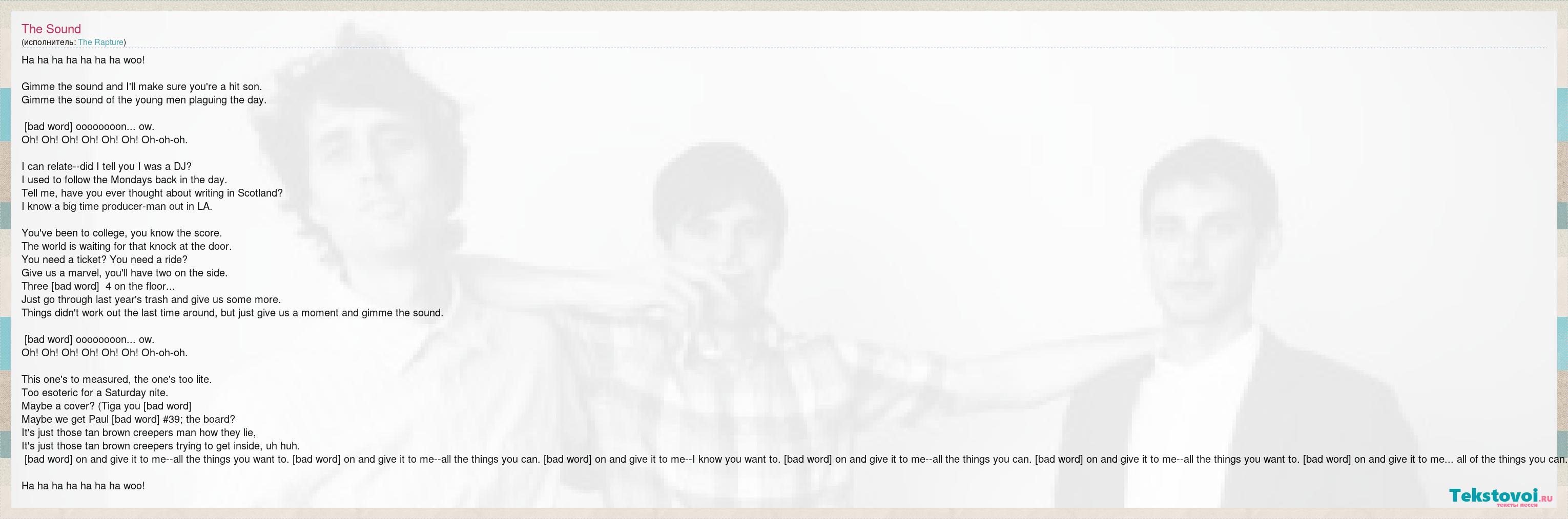 Нью-йоркская dance-punk-команда. Образована в 1998 году.The Rapture - команда, сочетающая в своем саунде элементы инди-рока, постпанка и эйсид-хауса. Иногда их стиль называют танцевальным панком. Этот ритмичный гитарно-танцевальный букет нашел немало сторонников как в старой Европе, так и в Новом Свете и даже в далекой Японии. Сами музыканты уверены, что впереди их ждет не иначе как мировой музыкальный... подробнее