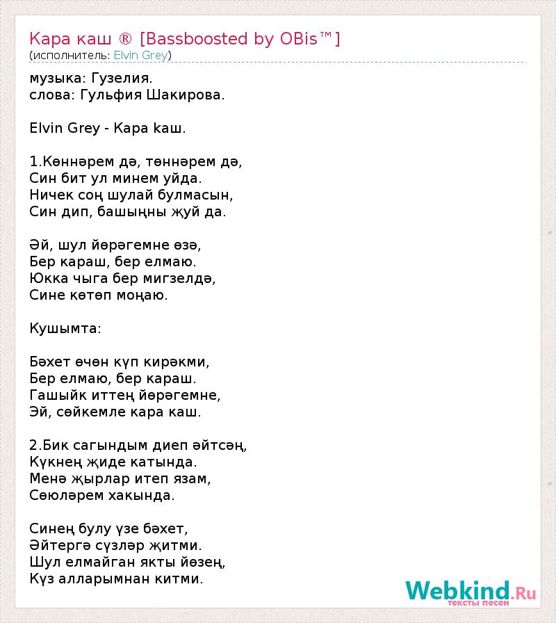 музыка: Гузелия. слова: Гульфия Шакирова. Elvin Grey - Кара kаш. 1.Көннәрем дә, төннәрем дә, Син бит ул минем уйда. Ничек соң шулай булмасын, Син дип, башыңны җуй да. Әй, шул йөрәгемне өзә, Бер караш, бер елмаю. Юкка чыга бер мигзелдә, Сине көтөп моңаю. Кушымта: Бәхет өчөн күп кирәкми, Бер елмаю, бер караш. Гашыйк иттең йөрәгемне, Эй, сөйкемле кара каш. 2.Бик сагындым диеп әйтсәң, Күкнең җиде катында. Менә җырлар итеп язам, Сөюләрем хакында. Синең булу үзе бәхет, Әйтергә сүзләр җитми. Шул елмайган якты йөзең, Күз алларымнан китми.