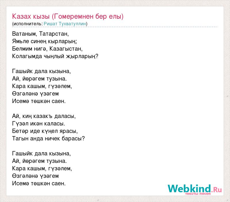 Ватаным, Татарстан, Ямьле синең кырларың; Белмим нигә, Казагыстан, Колагымда чыңлый җырларың? Гашыйк дала кызына, Ай, йөрәгем тузына. Кара кашым, гүзәлем, Өзгәләнә үзәгем Исемә төшкән саен. Ай, киң казакъ даласы, Гүзәл икән каласы. Бетәр иде күңел ярасы, Тагын анда ничек барасы? Гашыйк дала кызына, Ай, йөрәгем тузына. Кара кашым, гүзәлем, Өзгәләнә үзәгем Исемә төшкән саен.