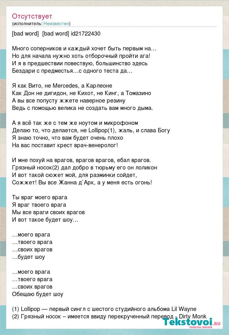 [bad word] [bad word] id21722430 Много соперников и каждый хочет быть первым на… Но для начала нужно хоть отборочный пройти ага! И я в предшествии повествую, большинство здесь Бездари с предместья…с одного теста да… Я как Вито, не Mercedes, а Карлеоне Как Дон не дигидон, не Кихот, не Кинг, а Томазино А вы все попусту жжете наверное резину Ведь с помощью велика не создать вам много дыма. А я всё так же с тем же ноутом и микрофоном Делаю то, что делается, не Lollipop(1), жаль, и слава Богу Я знаю точно, что вам будет очень плохо На вас поставит крест врач-венеролог! И мне похуй на врагов, врагов врагов, ебал врагов. Грязный носок(2) дал добро в тюрьму его он лоликон И вот такой сюжет мой, для разминки сойдет, Сожжет! Вы все Жанна д`Арк, а у меня есть огонь! Ты враг моего врага Я враг твоего врага Мы все враги своих врагов И вот такое будет шоу… …моего врага …твоего врага …своих врагов …будет шоу …моего врага …твоего врага …своих врагов Обещаю будет шоу (1) Lollipop — первый сингл с шестого студийного альбома Lil Wayne (2) Грязный носок – имеется ввиду перекрученный перевод - Dirty Monk