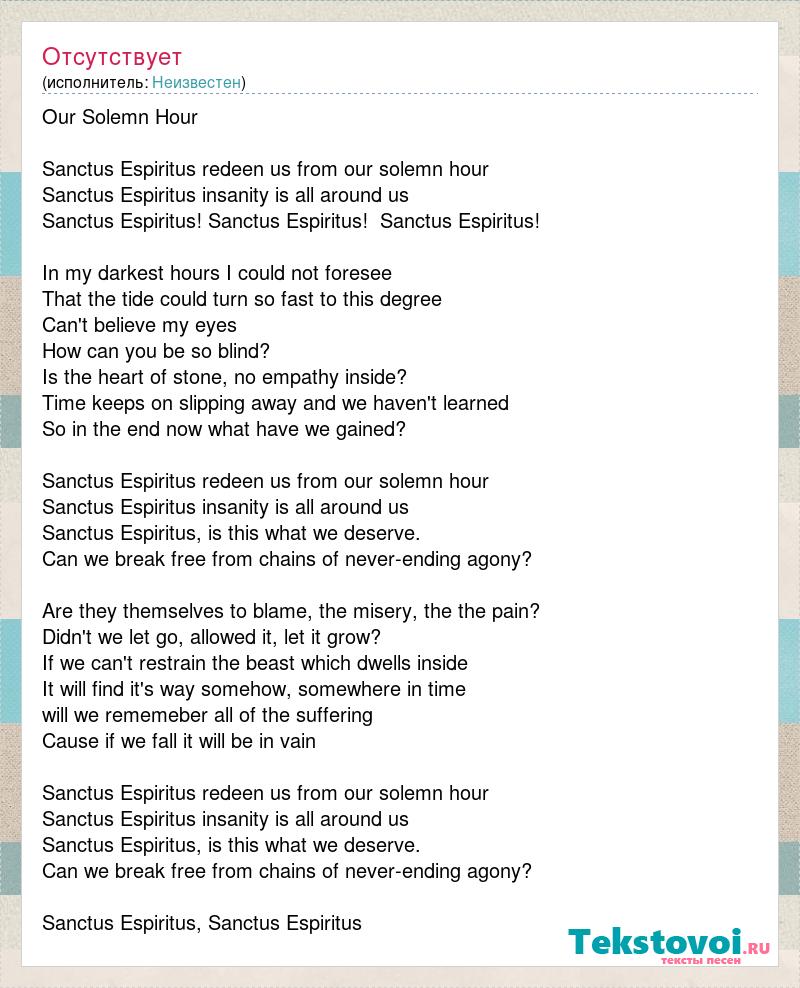Our Solemn Hour Sanctus Espiritus redeen us from our solemn hour Sanctus Espiritus insanity is all around us Sanctus Espiritus! Sanctus Espiritus! Sanctus Espiritus! In my darkest hours I could not foresee That the tide could turn so fast to this degree Can't believe my eyes How can you be so blind? Is the heart of stone, no empathy inside? Time keeps on slipping away and we haven't learned So in the end now what have we gained? Sanctus Espiritus redeen us from our solemn hour Sanctus Espiritus insanity is all around us Sanctus Espiritus, is this what we deserve. Can we break free from chains of never-ending agony? Are they themselves to blame, the misery, the the pain? Didn't we let go, allowed it, let it grow? If we can't restrain the beast which dwells inside It will find it's way somehow, somewhere in time will we rememeber all of the suffering Cause if we fall it will be in vain Sanctus Espiritus redeen us from our solemn hour Sanctus Espiritus insanity is all around us Sanctus Espiritus, is this what we deserve. Can we break free from chains of never-ending agony? Sanctus Espiritus, Sanctus Espiritus