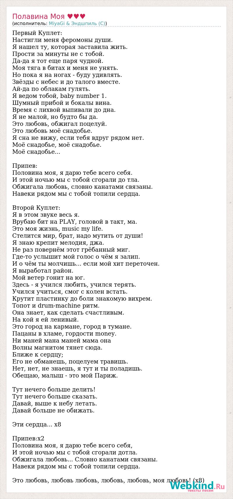 Первый Куплет: Настигли меня феромоны души. Я нашел ту, которая заставила жить. Прости за минуты не с тобой. Да-да я тот еще паря чудной. Моя тяга в битах и меня не унять. Но пока я на ногах - буду удивлять. Звёзды с небес и до талого вместе. Ай-да по облакам гулять. Я ведом тобой, baby number 1. Шумный прибой и бокалы вина. Время с лихвой выпивали до дна. Я не малой, но будто бы да. Это любовь, обжигал поцелуй. Это любовь моё снадобье. Я сна не вижу, если тебя вдруг рядом нет. Моё снадобье, моё снадобье. Моё снадобье... Припев: Половина моя, я дарю тебе всего себя. И этой ночью мы с тобой сгорали до тла. Обжигала любовь, словно канатами связаны. Навеки рядом мы с тобой топили сердца. Второй Куплет: Я в этом звуке весь я. Врубаю бит на PLAY, головой в такт, ма. Это моя жизнь, music my life. Стелится мир, брат, надо мутить от души! Я знаю крепит мелодия, джа. Не раз повернём этот грёбанный миг. Где-то услышит мой голос о чём я залип. И о чём ты молчишь... если мой хит переточен. Я выработал район. Мой ветер гонит на юг. Здесь - я учился любить, учился терять. Учился учиться, смог с колен встать. Крутит пластинку до боли знакомую вихрем. Топот и drum-machine ритм. Она знает, как сделать счастливым. На кой я ей ленивый. Это город на кармане, город в тумане. Пацаны в хламе, гордости money. Ни маней мана маней мама она Волны магнитом тянет сюда. Ближе к сердцу; Его не обманешь, поцелуем травишь. Нет, нет, не знаешь, я тут и ты поладишь. Обещаю, малыш - это мой Париж. Тут нечего больше делить! Тут нечего больше сказать. Давай, выше к небу летать. Давай больше не обижать. Эти сердца... x8 Припев:x2 Половина моя, я дарю тебе всего себя, И этой ночью мы с тобой сгорали дотла. Обжигала любовь... Словно канатами связаны. Навеки рядом мы с тобой топили сердца. Это любовь, любовь любовь, любовь, любовь, моя любовь! (х8)