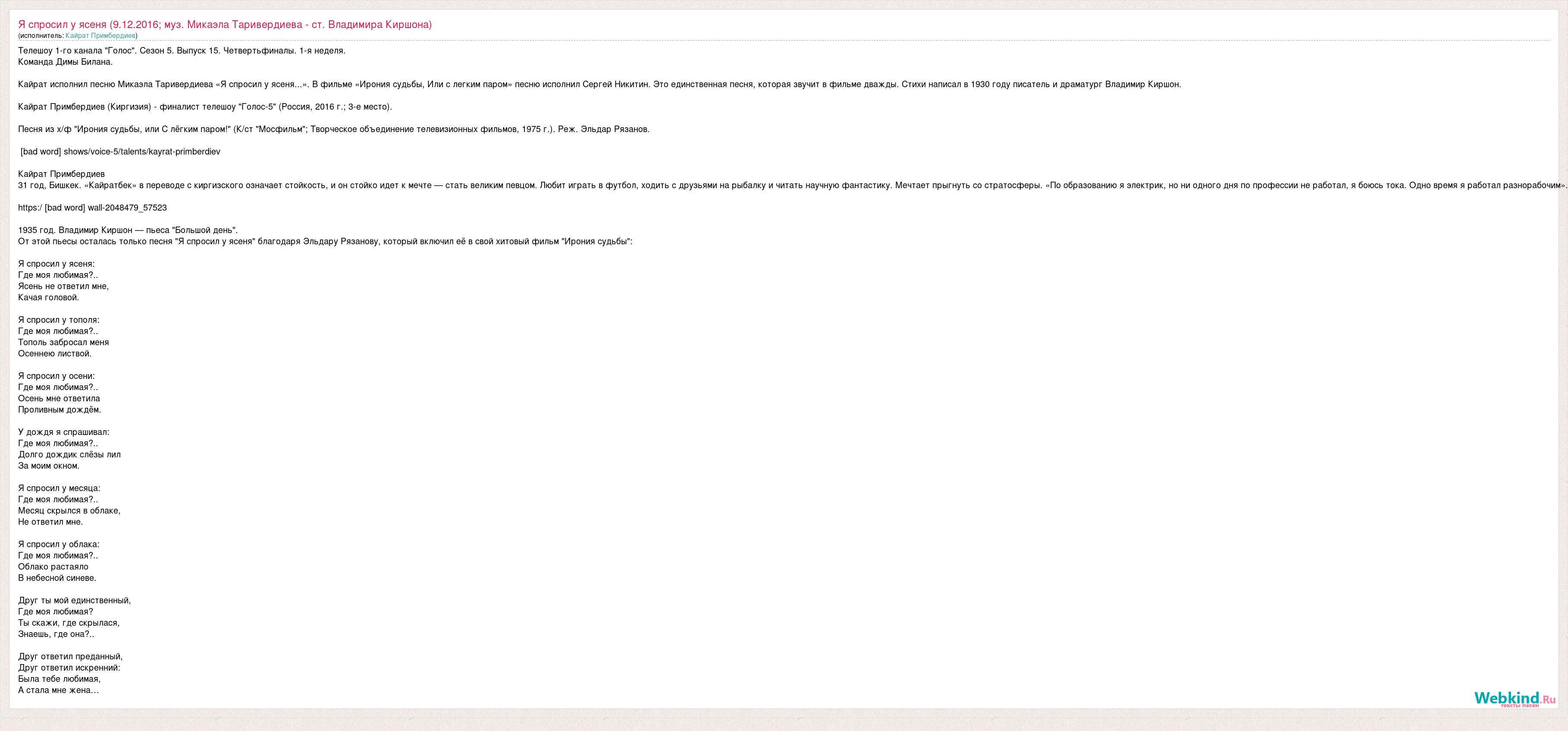 Телешоу 1-го канала "Голос". Сезон 5. Выпуск 15. Четвертьфиналы. 1-я неделя. Команда Димы Билана. Кайрат исполнил песню Микаэла Таривердиева «Я спросил у ясеня...». В фильме «Ирония судьбы, Или с легким паром» песню исполнил Сергей Никитин. Это единственная песня, которая звучит в фильме дважды. Стихи написал в 1930 году писатель и драматург Владимир Киршон. Кайрат Примбердиев (Киргизия) - финалист телешоу "Голос-5" (Россия, 2016 г.; 3-е место). Песня из х/ф "Ирония судьбы, или С лёгким паром!" (К/ст "Мосфильм"; Творческое объединение телевизионных фильмов, 1975 г.). Реж. Эльдар Рязанов. [bad word] shows/voice-5/talents/kayrat-primberdiev Кайрат Примбердиев 31 год, Бишкек. «Кайратбек» в переводе с киргизского означает стойкость, и он стойко идет к мечте — стать великим певцом. Любит играть в футбол, ходить с друзьями на рыбалку и читать научную фантастику. Мечтает прыгнуть со стратосферы. «По образованию я электрик, но ни одного дня по профессии не работал, я боюсь тока. Одно время я работал разнорабочим». https:/ [bad word] wall-2048479_57523 1935 год. Владимир Киршон — пьеса "Большой день". От этой пьесы осталась только песня "Я спросил у ясеня" благодаря Эльдару Рязанову, который включил её в свой хитовый фильм "Ирония судьбы": Я спросил у ясеня: Где моя любимая?.. Ясень не ответил мне, Качая головой. Я спросил у тополя: Где моя любимая?.. Тополь забросал меня Осеннею листвой. Я спросил у осени: Где моя любимая?.. Осень мне ответила Проливным дождём. У дождя я спрашивал: Где моя любимая?.. Долго дождик слёзы лил За моим окном. Я спросил у месяца: Где моя любимая?.. Месяц скрылся в облаке, Не ответил мне. Я спросил у облака: Где моя любимая?.. Облако растаяло В небесной синеве. Друг ты мой единственный, Где моя любимая? Ты скажи, где скрылася, Знаешь, где она?.. Друг ответил преданный, Друг ответил искренний: Была тебе любимая, А стала мне жена…