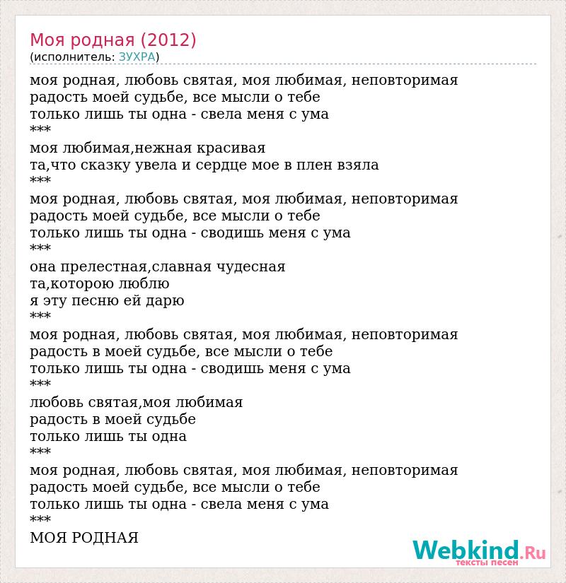 моя родная, любовь святая, моя любимая, неповторимая радость моей судьбе, все мысли о тебе только лишь ты одна - свела меня с ума *** моя любимая,нежная красивая та,что сказку увела и сердце мое в плен взяла *** моя родная, любовь святая, моя любимая, неповторимая радость моей судьбе, все мысли о тебе только лишь ты одна - сводишь меня с ума *** она прелестная,славная чудесная та,которою люблю я эту песню ей дарю *** моя родная, любовь святая, моя любимая, неповторимая радость в моей судьбе, все мысли о тебе только лишь ты одна - сводишь меня с ума *** любовь святая,моя любимая радость в моей судьбе только лишь ты одна *** моя родная, любовь святая, моя любимая, неповторимая радость моей судьбе, все мысли о тебе только лишь ты одна - свела меня с ума *** МОЯ РОДНАЯ