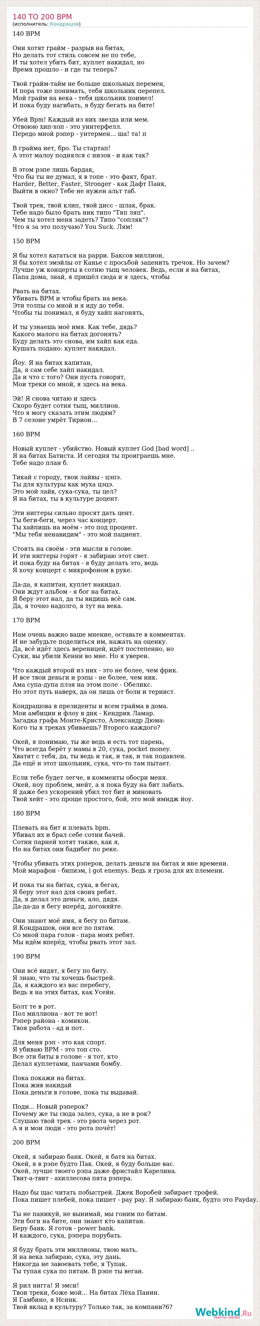 140 BPM Они хотят грайм - разрыв на битах, Но делать тот стиль совсем не по тебе, И ты хотел убить бит, куплет накидал, но Время прошло - и где ты теперь? Твой грайм-тайм не больше школьных перемен, И пора тоже понимать, тебя школьник перепел. Мой грайм на века - тебя школьник поимел! И пока буду нагибать, я буду бегать на бите! Убей Bpm! Каждый из них звезда или мем. Отвоюю хип-хоп - это уинтерфелл. Передо мной рэпер - унтермен... ша! та! п В грайма нет, бро. Ты стартап! А этот малоу поднялся с низов - и как так? В этом рэпе лишь бардак, Что бы ты не думал, я в топе - это факт, брат. Harder, Better, Faster, Stronger - как Дафт Панк, Выйти в окно? Тебе не нужен альт таб. Твой трек, твой клип, твой дисс - шлак, брак. Тебе надо было брать ник типо "Тяп ляп". Чем ты хотел меня задеть? Типо "сопляк"? Что я за это получаю? You Suck. Лям! 150 BPM Я бы хотел кататься на рарри. Баксов миллион, Я бы хотел эмэйлы от Канье с просьбой заценить тречок. Но зачем? Лучше уж концерты в сотню тыщ человек. Ведь, если я на битах, Папа дома, знай, я пришёл сюда и я здесь, чтобы Рвать на битах. Убивать BPM и чтобы брать на века. Эти толпы со мной и я иду до тебя. Чтобы ты понимал, я буду хайп нагонять, И ты узнаешь моё имя. Как тебе, дядь? Какого малого на битах догонять? Буду делать это снова, им хайп как еда. Кушать подано: куплет накидал. Йоу. Я на битах капитан, Да, я сам себе хайп накидал. Да и что с того? Они пусть говорят, Мои треки со мной, я здесь на века. Эй! Я снова читаю и здесь Скоро будет сотня тыщ, миллион. Что я могу сказать этим людям? В 7 сезоне умрёт Тирион... 160 BPM Новый куплет - убийство. Новый куплет God [bad word] .. Я на битах Батиста. И сегодня ты проиграешь мне. Тебе надо план б. Тикай с городу, твои лайвы - цэпэ. Ты для культуры как муха цэцэ. Это мой лайв, сука-сука, ты цел? Я на битах, ты в культуре доцент. Эти ниггеры сильно просят дать цент. Ты беги-беги, через час концерт. Ты хайпишь на моём - это под процент. "Мы тебя ненавидим" - это мой пациент. Стоять на своём - эти мысли в голове. И эти ниггеры горят - я забираю этот свет. И пока буду на битах - я буду делать это, ведь Я хочу концерт с микрофоном в руке. Да-да, я капитан, куплет накидал. Они ждут альбом - я бог на битах. Я беру этот нал, да ты видишь всё сам. Да, я точно надолго, я тут на века. 170 BPM Нам очень важно ваше мнение, оставьте в комментах. И не забудьте поделиться им, нажать на оценку. Да, всё идёт здесь вереницей, идёт постепенно, но Суки, вы убили Кенни во мне. Но я уверен. Что каждый второй из них - это не более, чем фрик. И все твои деньги и рэпы - не более, чем ник. Ама супа-дупа плэя на этом поле - Обеликс. Но этот путь наверх, да он лишь от боли и тернист. Кондрашова в президенты и всем грайма в дома. Мои амбиции и флоу в днк - Кендрик Ламар. Загадка графа Монте-Кристо, Александр Дюма: Кого ты в треках убиваешь? Второго каждого? Окей, я понимаю, ты же ведь и есть тот парень, Что всегда берёт у мамы в 20, сука, pocket money. Хватит с тебя, да, ты ведь и так, и так, и так подавлен. Да ещё и этот школьник, сука, что-то там пытает. Если тебе будет легче, в комменты обосри меня. Окей, ноу проблем, мейт, а я пока буду на бит лабать. Я даже без ускорений убил тот бит и миновать Твой хейт - это проще простого, бой, это мой имидж йоу. 180 BPM Плевать на бит и плевать bpm. Убивал их и брал себе сотни бачей. Сотни парней хотят также, как я, Но на битах они бадибег по реке. Чтобы убивать этих рэперов, делать деньги на битах и вне времени. Мой марафон