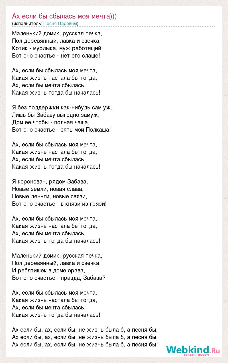 Маленький домик, русская печка, Пол деревянный, лавка и свечка, Котик - мурлыка, муж работящий, Вот оно счастье - нет его слаще! Ах, если бы сбылась моя мечта, Какая жизнь настала бы тогда, Ах, если бы мечта сбылась, Какая жизнь тогда бы началась! Я без поддержки как-нибудь сам уж, Лишь бы Забаву выгодно замуж, Дом ее чтобы - полная чаша, Вот оно счастье - зять мой Полкаша! Ах, если бы сбылась моя мечта, Какая жизнь настала бы тогда, Ах, если бы мечта сбылась, Какая жизнь тогда бы началась! Я коронован, рядом Забава, Новые земли, новая слава, Новые деньги, новые связи, Вот оно счастье - в князи из грязи! Ах, если бы сбылась моя мечта, Какая жизнь настала бы тогда, Ах, если бы мечта сбылась, Какая жизнь тогда бы началась! Маленький домик, русская печка, Пол деревянный, лавка и свечка, И ребятишек в доме орава, Вот оно счастье - правда, Забава? Ах, если бы сбылась моя мечта, Какая жизнь настала бы тогда, Ах, если бы мечта сбылась, Какая жизнь тогда бы началась! Ах если бы, ах, если бы, не жизнь была б, а песня бы, Ах если бы, ах, если бы, не жизнь была б, а песня бы, Ах если бы, ах, если бы, не жизнь была б, а песня бы!