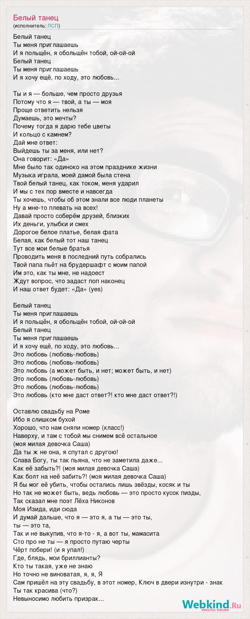 Белый танец Ты меня приглашаешь И я польщён, я обольщён тобой, ой-ой-ой Белый танец Ты меня приглашаешь И я хочу ещё, по ходу, это любовь... Ты и я — больше, чем просто друзья Потому что я — твой, а ты — моя Проще ответить нельзя Думаешь, это мечты? Почему тогда я дарю тебе цветы И кольцо с камнем? Дай мне ответ: Выйдешь ты за меня, или нет? Она говорит: «Да» Мне было так одиноко на этом празднике жизни Музыка играла, моей дамой была стена Твой белый танец, как током, меня ударил И мы с тех пор вместе и навсегда Ты хочешь, чтобы об этом знали все люди планеты Ну а мне-то плевать на всех! Давай просто соберём друзей, близких Их деньги, улыбки и смех Дорогое белое платье, белая фата Белая, как белый тот наш танец Тут все мои белые братья Проводить меня в последний путь собрались Твой папа пьёт на брудершафт с моим папой Им это, как ты мне, не надоест Ждут вопрос, что задаст поп наконец И наш ответ будет: «Да» (yes) Белый танец Ты меня приглашаешь И я польщён, я обольщён тобой, ой-ой-ой Белый танец Ты меня приглашаешь И я хочу ещё, по ходу, это любовь... Это любовь (любовь-любовь) Это любовь (любовь-любовь) Это любовь (а может быть, и нет; может быть, и нет) Это любовь (любовь-любовь) Это любовь (любовь-любовь) Это любовь (кто мне даст ответ?! кто мне даст ответ?!) Оставлю свадьбу на Роме Ибо я слишком бухой Хорошо, что нам сняли номер (класс!) Наверху, и там с тобой мы снимем всё остальное (моя милая девочка Саша) Да ты ж не она, я спутал с другою! Слава Богу, ты так пьяна, что не заметила даже... Как её забыть?! (моя милая девочка Саша) Как болт на неё забить?! (моя милая девочка Саша) Я бы мог её убить, чтобы остались лишь звёзды, косяк и ты Но так не может быть, ведь любовь — это просто кусок пизды, Так сказал мне поэт Лёха Никонов Моя Изида, иди сюда И думай дальше, что я — это я, а ты — это ты, ты — это та, Так и не выкупив, что я-то - я, а вот ты, мамасита Сто про не ты — я просто путаю черты Чёрт побери! (и я упал!) Где, блядь, мои бриллианты? Кто ты такая, уже не знаю Но точно не виноватая, я, я, Я Сам пришёл на эту свадьбу, в этот номер, Ключ в двери изнутри - знак Ты так красива (что?) Невыносимо любить призрак...