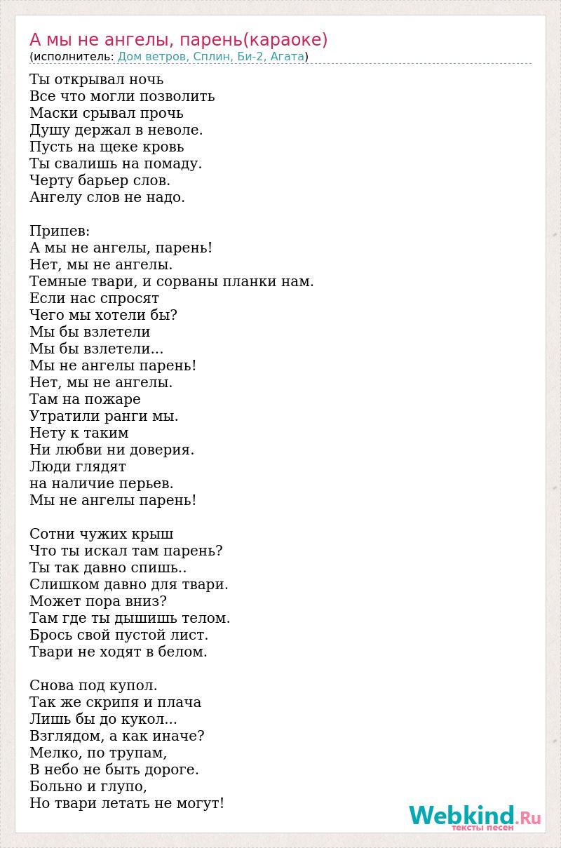 Ты открывал ночь Все что могли позволить Маски срывал прочь Душу держал в неволе. Пусть на щеке кровь Ты свалишь на помаду. Черту барьер слов. Ангелу слов не надо. Припев: А мы не ангелы, парень! Нет, мы не ангелы. Темные твари, и сорваны планки нам. Если нас спросят Чего мы хотели бы? Мы бы взлетели Мы бы взлетели... Мы не ангелы парень! Нет, мы не ангелы. Там на пожаре Утратили ранги мы. Нету к таким Ни любви ни доверия. Люди глядят на наличие перьев. Мы не ангелы парень! Сотни чужих крыш Что ты искал там парень? Ты так давно спишь.. Слишком давно для твари. Может пора вниз? Там где ты дышишь телом. Брось свой пустой лист. Твари не ходят в белом. Снова под купол. Так же скрипя и плача Лишь бы до кукол... Взглядом, а как иначе? Мелко, по трупам, В небо не быть дороге. Больно и глупо, Но твари летать не могут!