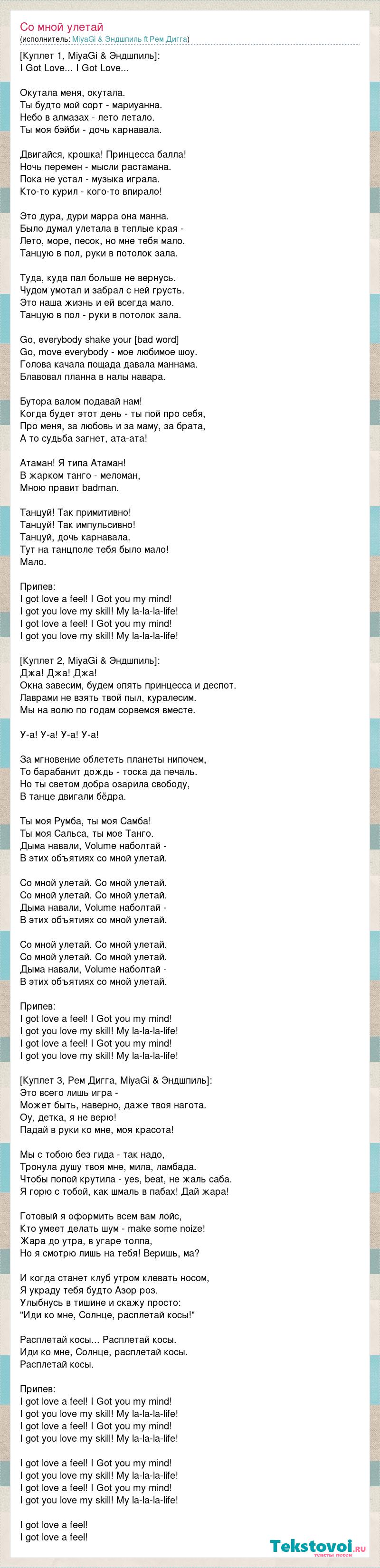 [Куплет 1, MiyaGi & Эндшпиль]: I Got Love... I Got Love... Окутала меня, окутала. Ты будто мой сорт - мариуанна. Небо в алмазах - лето летало. Ты моя бэйби - дочь карнавала. Двигайся, крошка! Принцесса балла! Ночь перемен - мысли растамана. Пока не устал - музыка играла. Кто-то курил - кого-то впирало! Это дура, дури марра она манна. Было думал улетала в теплые края - Лето, море, песок, но мне тебя мало. Танцую в пол, руки в потолок зала. Туда, куда пал больше не вернусь. Чудом умотал и забрал с ней грусть. Это наша жизнь и ей всегда мало. Танцую в пол - руки в потолок зала. Go, everybody shake your [bad word] Go, move everybody - мое любимое шоу. Голова качала пощада давала маннама. Блавовал планна в налы навара. Бутора валом подавай нам! Когда будет этот день - ты пой про себя, Про меня, за любовь и за маму, за брата, А то судьба загнет, ата-ата! Атаман! Я типа Атаман! В жарком танго - меломан, Мною правит badman. Танцуй! Так примитивно! Танцуй! Так импульсивно! Танцуй, дочь карнавала. Тут на танцполе тебя было мало! Мало. Припев: I got love a feel! I Got you my mind! I got you love my skill! My la-la-la-life! I got love a feel! I Got you my mind! I got you love my skill! My la-la-la-life! [Куплет 2, MiyaGi & Эндшпиль]: Джа! Джа! Джа! Окна завесим, будем опять принцесса и деспот. Лаврами не взять твой пыл, куралесим. Мы на волю по годам сорвемся вместе. У-а! У-а! У-а! У-а! За мгновение облететь планеты нипочем, То барабанит дождь - тоска да печаль. Но ты светом добра озарила свободу, В танце двигали бёдра. Ты моя Румба, ты моя Самба! Ты моя Сальса, ты мое Танго. Дыма навали, Volume наболтай - В этих объятиях со мной улетай. Со мной улетай. Со мной улетай. Со мной улетай. Со мной улетай. Дыма навали, Volume наболтай - В этих объятиях со мной улетай. Со мной улетай. Со мной улетай. Со мной улетай. Со мной улетай. Дыма навали, Volume наболтай - В этих объятиях со мной улетай. Припев: I got love a feel! I Got you my mind! I got you love my skill! My la-la-la-life! I got love a feel! I Got you my mind! I got you love my skill! My la-la-la-life! [Куплет 3, Рем Дигга, MiyaGi & Эндшпиль]: Это всего лишь игра - Может быть, наверно, даже твоя нагота. Оу, детка, я не верю! Падай в руки ко мне, моя красота! Мы с тобою без гида - так надо, Тронула душу твоя мне, мила, ламбада. Чтобы попой крутила - yes, beat, не жаль саба. Я горю с тобой, как шмаль в пабах! Дай жара! Готовый я оформить всем вам лойс, Кто умеет делать шум - make some noize! Жара до утра, в угаре толпа, Но я смотрю лишь на тебя! Веришь, ма? И когда станет клуб утром клевать носом, Я украду тебя будто Азор роз. Улыбнусь в тишине и скажу просто: "Иди ко мне, Солнце, расплетай косы!" Расплетай косы... Расплетай косы. Иди ко мне, Солнце, расплетай косы. Расплетай косы. Припев: I got love a feel! I Got you my mind! I got you love my skill! My la-la-la-life! I got love a feel! I Got you my mind! I got you love my skill! My la-la-la-life! I got love a feel! I Got you my mind! I got you love my skill! My la-la-la-life! I got love a feel! I Got you my mind! I got you love my skill! My la-la-la-life! I got love a feel! I got love a feel!
