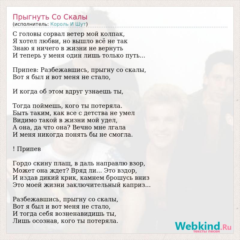 С головы сорвал ветер мой колпак, Я хотел любви, но вышло всё не так Знаю я ничего в жизни не вернуть И теперь у меня один лишь только путь... Припев: Разбежавшись, прыгну со скалы, Вот я был и вот меня не стало, И когда об этом вдруг узнаешь ты, Тогда поймешь, кого ты потеряла. Быть таким, как все с детства не умел Видимо такой в жизни мой удел, А она, да что она? Вечно мне лгала И меня никогда понять бы не смогла. ! Припев Гордо скину плащ, в даль направлю взор, Может она ждет? Вряд ли... Это вздор, И издав дикий крик, камнем брошусь вниз Это моей жизни заключительный каприз... Разбежавшись, прыгну со скалы, Вот я был и вот меня не стало, И тогда себя возненавидишь ты, Лишь осознав, кого ты потеряла.