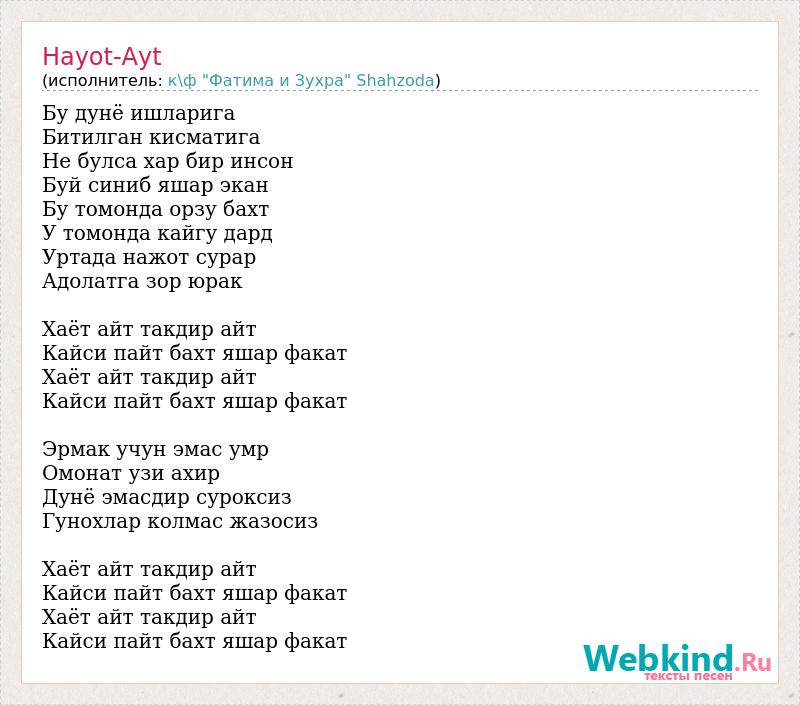 Бу дунё ишларига Битилган кисматига Не булса хар бир инсон Буй синиб яшар экан Бу томонда орзу бахт У томонда кайгу дард Уртада нажот сурар Адолатга зор юрак Хаёт айт такдир айт Кайси пайт бахт яшар факат Хаёт айт такдир айт Кайси пайт бахт яшар факат Эрмак учун эмас умр Омонат узи ахир Дунё эмасдир суроксиз Гунохлар колмас жазосиз Хаёт айт такдир айт Кайси пайт бахт яшар факат Хаёт айт такдир айт Кайси пайт бахт яшар факат