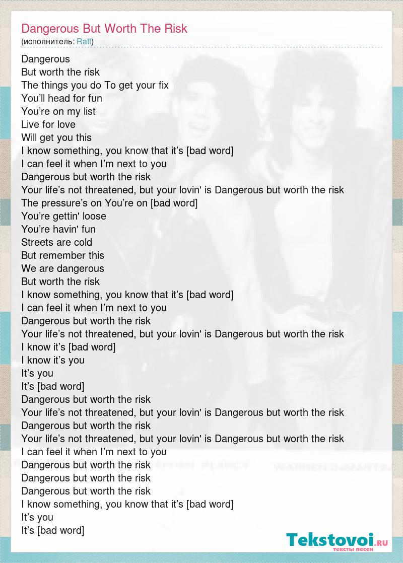 Dangerous But worth the risk The things you do To get your fix You’ll head for fun You’re on my list Live for love Will get you this I know something, you know that it’s [bad word] I can feel it when I’m next to you Dangerous but worth the risk Your life’s not threatened, but your lovin' is Dangerous but worth the risk The pressure’s on You’re on [bad word] You’re gettin' loose You’re havin' fun Streets are cold But remember this We are dangerous But worth the risk I know something, you know that it’s [bad word] I can feel it when I’m next to you Dangerous but worth the risk Your life’s not threatened, but your lovin' is Dangerous but worth the risk I know it’s [bad word] I know it’s you It’s you It’s [bad word] Dangerous but worth the risk Your life’s not threatened, but your lovin' is Dangerous but worth the risk Dangerous but worth the risk Your life’s not threatened, but your lovin' is Dangerous but worth the risk I can feel it when I’m next to you Dangerous but worth the risk Dangerous but worth the risk Dangerous but worth the risk I know something, you know that it’s [bad word] It’s you It’s [bad word]