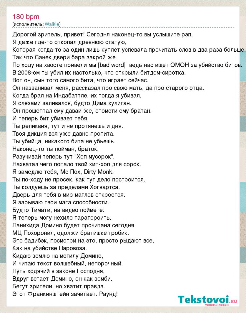 Дорогой зритель, привет! Сегодня наконец-то вы услышите рэп. Я даже где-то откопал древнюю статую, Которая когда-то за один лишь куплет успевала прочитать слов в два раза больше. Так что Санек двери бара закрой же. По ходу на хвосте привели мы [bad word] ведь нас ищет ОМОН за убийство битов. В 2008-ом ты убил их настолько, что открыли битдом-сиротка. Вот он, сын того самого бита, что играет сейчас. Он названивал меня, рассказал про свою мать, да про старого отца. Когда брал на Индабаттле, их тогда я убивал. Я слезами заливался, будто Дима хулиган. Он прошептал ему давай-же, отомсти ему братан. И теперь бит убивает тебя, Ты реликвия, тут и не протянешь и дня. Твоя дикция вся уже давно пропита. Ты убийца, никакого бита не убьешь. Наконец-то ты пойман, браток. Разучивай теперь тут "Хоп мусорок". Нахватал чего попало твой хип-хоп для сорок. Я замедлю тебя, Mc Пох, Dirty Monk. Ты по-ходу не просек, как тут дело построится. Ты колдуешь за пределами Хогвартса. Дверь для тебя в мир маглов откроется. Я зарываю твои мага способности. Будто Тимати, на видео поймете. Я теперь могу нехило таратороить. Панихида Домино будет прочитана сегодня. МЦ Похоронил, одолжи братишке гробик. Это бадибэк, посмотри на это, просто рыдают все, Как на убийстве Паровоза. Кидаю землю на могилу Домино, И читаю текст волшебный, непорочный. Путь ходячий в законе Господня, Вдруг встает Домино, он как зомби. Бегут зрители, но хватит правда. Этот Франкинштейн зачитает. Раунд!