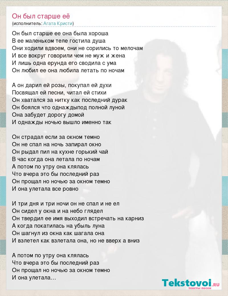 Он был старше ее она была хороша В ее маленьком теле гостила душа Они ходили вдвоем, они не сорились то мелочам И все вокруг говорили чем не муж и жена И лишь одна ерунда его сводила с ума Он любил ее она любила летать по ночам А он дарил ей розы, покупал ей духи Посвящал ей песни, читал ей стихи Он хватался за нитку как последний дурак Он боялся что однаждыпод полной луной Она забудет дорогу домой И однажды ночью вышло именно так Он страдал если за окном темно Он не спал на ночь запирал окно Он рыдал пил на кухне горький чай В час когда она летала по ночам А потом по утру она клялась Что вчера это бы последний раз Он прощал но ночью за окном темно И она улетала все ровно И три дня и три ночи он не спал и не ел Он сидел у окна и на небо глядел Он твердил ее имя выходил встречать на карниз А когда покатилась на убыль луна Он шагнул из окна как шагала она И взлетел как взлетала она, но не вверх а вниз А потом по утру она клялась Что вчера это бы последний раз Он прощал но ночью за окном темно И она улетала…