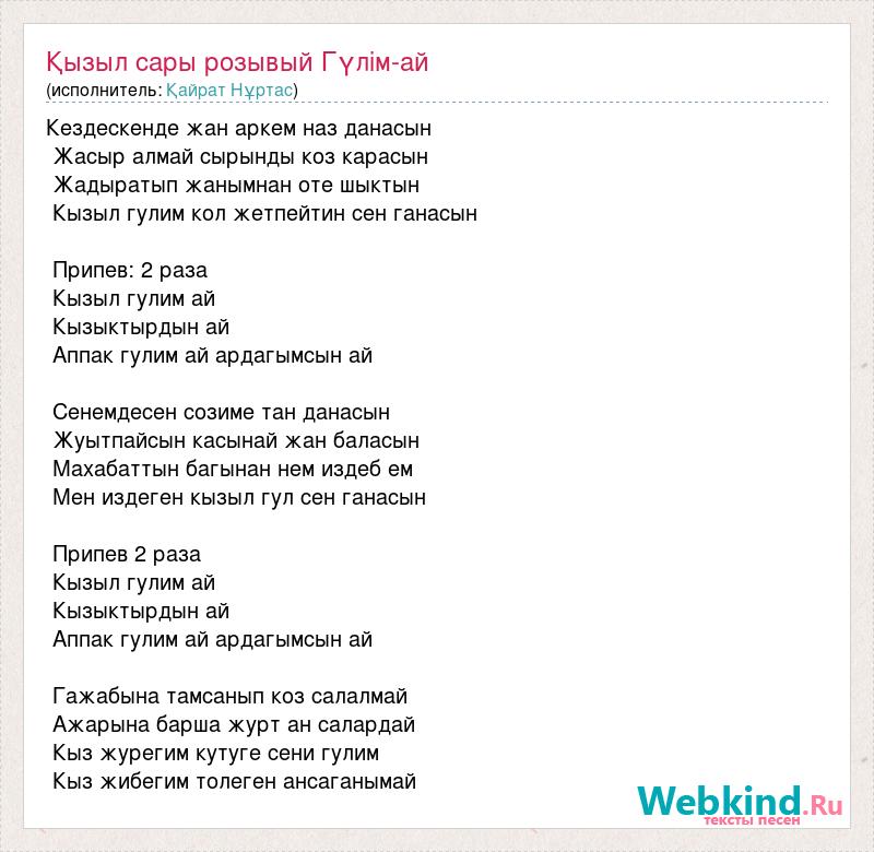 Кездескенде жан аркем наз данасын Жасыр алмай сырынды коз карасын Жадыратып жанымнан оте шыктын Кызыл гулим кол жетпейтин сен ганасын Припев: 2 раза Кызыл гулим ай Кызыктырдын ай Аппак гулим ай ардагымсын ай Сенемдесен созиме тан данасын Жуытпайсын касынай жан баласын Махабаттын багынан нем издеб ем Мен издеген кызыл гул сен ганасын Припев 2 раза Кызыл гулим ай Кызыктырдын ай Аппак гулим ай ардагымсын ай Гажабына тамсанып коз салалмай Ажарына барша журт ан салардай Кыз журегим кутуге сени гулим Кыз жибегим толеген ансаганымай
