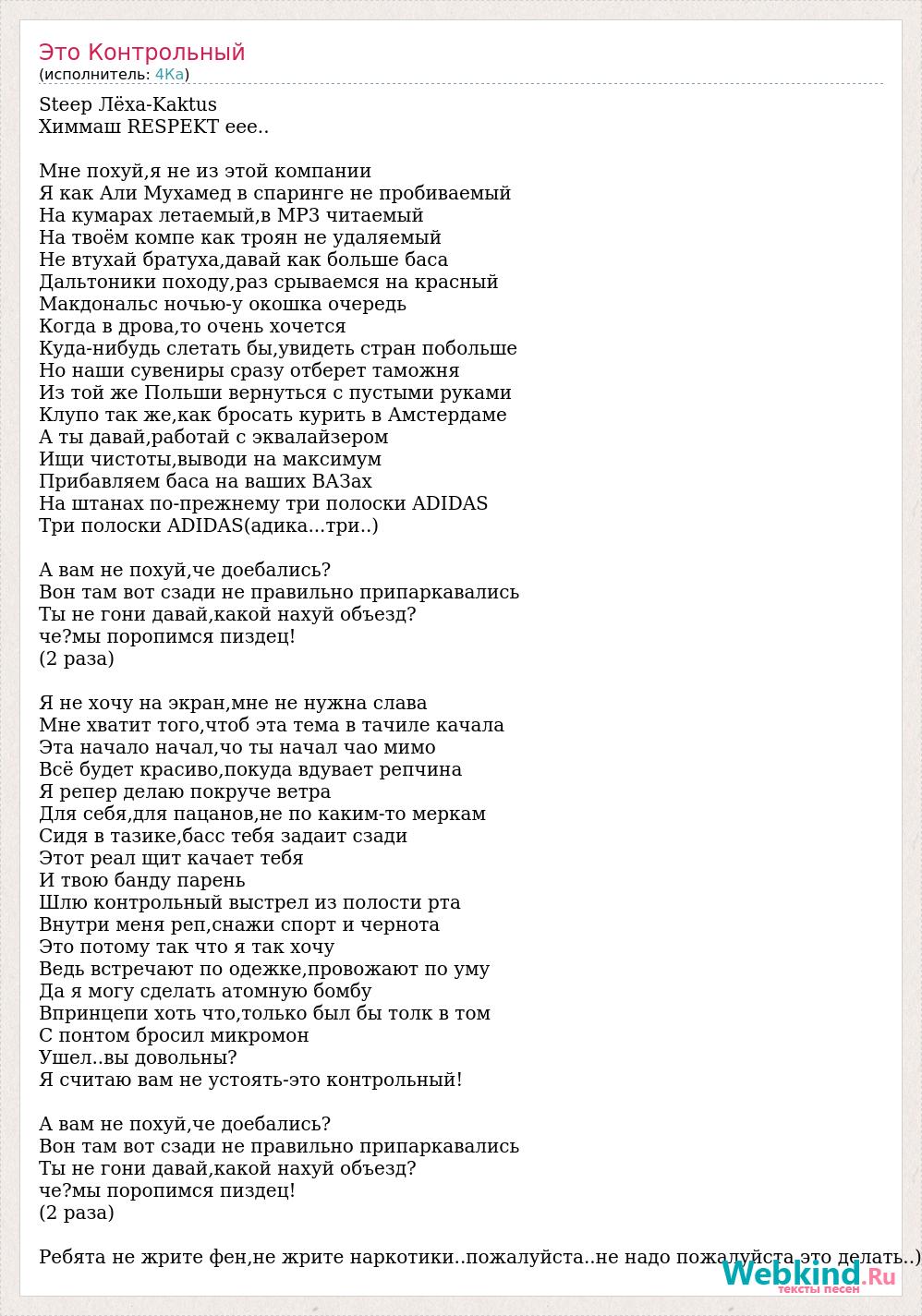 Steep Лёха-Kaktus Химмаш RESPEKT еее.. Мне похуй,я не из этой компании Я как Али Мухамед в спаринге не пробиваемый На кумарах летаемый,в MP3 читаемый На твоём компе как троян не удаляемый Не втухай братуха,давай как больше баса Дальтоники походу,раз срываемся на красный Макдональс ночью-у окошка очередь Когда в дрова,то очень хочется Куда-нибудь слетать бы,увидеть стран побольше Но наши сувениры сразу отберет таможня Из той же Польши вернуться с пустыми руками Клупо так же,как бросать курить в Амстердаме А ты давай,работай с эквалайзером Ищи чистоты,выводи на максимум Прибавляем баса на ваших ВАЗах На штанах по-прежнему три полоски ADIDAS Три полоски ADIDAS(адика...три..) А вам не похуй,че доебались? Вон там вот сзади не правильно припаркавались Ты не гони давай,какой нахуй объезд? че?мы поропимся пиздец! (2 раза) Я не хочу на экран,мне не нужна слава Мне хватит того,чтоб эта тема в тачиле качала Эта начало начал,чо ты начал чао мимо Всё будет красиво,покуда вдувает репчина Я репер делаю покруче ветра Для себя,для пацанов,не по каким-то меркам Сидя в тазике,басс тебя задаит сзади Этот реал щит качает тебя И твою банду парень Шлю контрольный выстрел из полости рта Внутри меня реп,снажи спорт и чернота Это потому так что я так хочу Ведь встречают по одежке,провожают по уму Да я могу сделать атомную бомбу Впринцепи хоть что,только был бы толк в том С понтом бросил микромон Ушел..вы довольны? Я считаю вам не устоять-это контрольный! А вам не похуй,че доебались? Вон там вот сзади не правильно припаркавались Ты не гони давай,какой нахуй объезд? че?мы поропимся пиздец! (2 раза) Ребята не жрите фен,не жрите наркотики..пожалуйста..не надо пожалуйста это делать..)