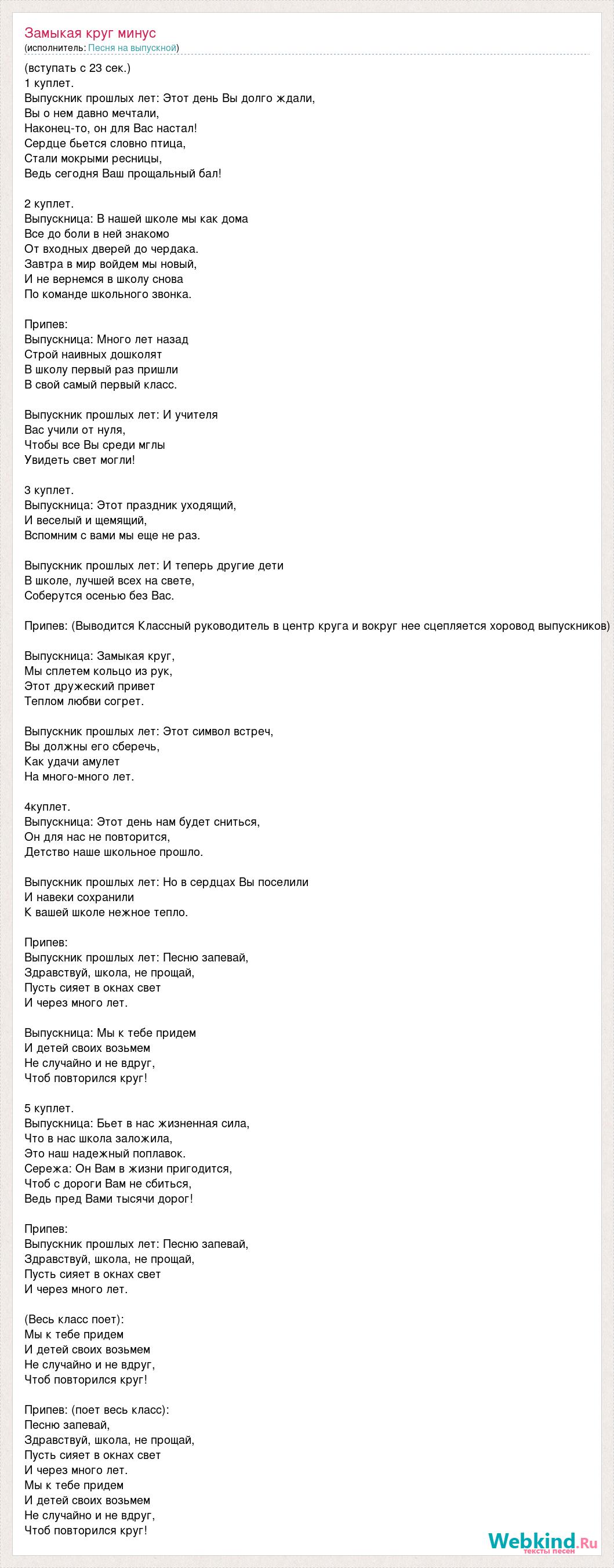 (вступать с 23 сек.) 1 куплет. Выпускник прошлых лет: Этот день Вы долго ждали, Вы о нем давно мечтали, Наконец-то, он для Вас настал! Сердце бьется словно птица, Стали мокрыми ресницы, Ведь сегодня Ваш прощальный бал! 2 куплет. Выпускница: В нашей школе мы как дома Все до боли в ней знакомо От входных дверей до чердака. Завтра в мир войдем мы новый, И не вернемся в школу снова По команде школьного звонка. Припев: Выпускница: Много лет назад Строй наивных дошколят В школу первый раз пришли В свой самый первый класс. Выпускник прошлых лет: И учителя Вас учили от нуля, Чтобы все Вы среди мглы Увидеть свет могли! 3 куплет. Выпускница: Этот праздник уходящий, И веселый и щемящий, Вспомним с вами мы еще не раз. Выпускник прошлых лет: И теперь другие дети В школе, лучшей всех на свете, Соберутся осенью без Вас. Припев: (Выводится Классный руководитель в центр круга и вокруг нее сцепляется хоровод выпускников) Выпускница: Замыкая круг, Мы сплетем кольцо из рук, Этот дружеский привет Теплом любви согрет. Выпускник прошлых лет: Этот символ встреч, Вы должны его сберечь, Как удачи амулет На много-много лет. 4куплет. Выпускница: Этот день нам будет сниться, Он для нас не повторится, Детство наше школьное прошло. Выпускник прошлых лет: Но в сердцах Вы поселили И навеки сохранили К вашей школе нежное тепло. Припев: Выпускник прошлых лет: Песню запевай, Здравствуй, школа, не прощай, Пусть сияет в окнах свет И через много лет. Выпускница: Мы к тебе придем И детей своих возьмем Не случайно и не вдруг, Чтоб повторился круг! 5 куплет. Выпускница: Бьет в нас жизненная сила, Что в нас школа заложила, Это наш надежный поплавок. Сережа: Он Вам в жизни пригодится, Чтоб с дороги Вам не сбиться, Ведь пред Вами тысячи дорог! Припев: Выпускник прошлых лет: Песню запевай, Здравствуй, школа, не прощай, Пусть сияет в окнах свет И через много лет. (Весь класс поет): Мы к тебе придем И детей своих возьмем Не случайно и не вдруг, Чтоб повторился круг! Припев: (поет весь класс): Песню запевай, Здравствуй, школа, не прощай, Пусть сияет в окнах свет И через много лет. Мы к тебе придем И детей своих возьмем Не случайно и не вдруг, Чтоб повторился круг!