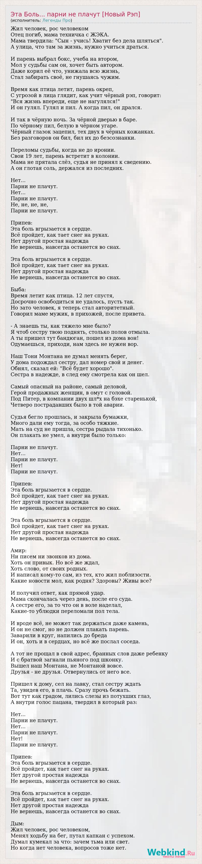 Жил человек, рос человеком Отец погиб, мама техничка с ЖЭКА. Мама твердила: "Сын - учись! Хватит без дела шляться". А улица, что там за жизнь, нужно учиться драться. И парень выбрал бокс, учеба на втором, Мол у судьбы сам он, хочет быть автором. Даже корил её что, унижала всю жизнь, Стал забирать своё, не гнушаясь чужим. Время как птица летит, парень окреп, С угрозой в лица глядит, как учит чёрный рэп, говорит: "Вся жизнь впереди, еще не нагулялся!" И он гулял. Гулял и пил. А когда пил, он дрался. И так в чёрную ночь. За чёрной дверью в баре. По чёрному пил, белую в чёрном угаре. Чёрный глазок зацепил, тех двух в чёрных кожанках. Без разговоров он бил, бил их до безсознанки. Переломы судьбы, когда не до иронии. Свои 19 лет, парень встретит в колонии. Мама не прятала слёз, судья не принял к сведению. А он глотая соль, держался из последних. Нет... Парни не плачут. Нет... Парни не плачут. Не, не, не, не, Парни не плачут. Припев: Эта боль вгрызается в сердце. Всё пройдет, как тает снег на руках. Нет другой простая надежда Не вернешь, навсегда останется во снах. Эта боль вгрызается в сердце. Всё пройдет, как тает снег на руках. Нет другой простая надежда Не вернешь, навсегда останется во снах. Быба: Время летит как птица. 12 лет спустя, Досрочно освободиться не удалось, пусть так. Но зато человек, я теперь стал авторитетный. Говорил маме мужик, в прихожей, после привета. - А знаешь ты, как тяжело мне было? Я чтоб сестру твою поднять, столько полов отмыла. А ты пришел тут бандюган, пошел из дома вон! Одумаешься, приходи, нам здесь не нужен вор. Наш Тони Монтана не думал менять берег, У дома подождал сестру, дал номер свой и денег. Обнял, сказал ей: "Всё будет хорошо". Сестра в надежде, в след ему смотрела как он шел. Самый опасный на районе, самый деловой, Герой продажных женщин, в омут с головой. Под Питер, в компании двух шл*х на бэхе старенькой, Четверо пострадавших было в той аварии. Судья бегло прошлась, и закрыла бумажки, Много дали ему тогда, за особо тяжкие. Мать на суд не пришла, сестра рыдала тихонько. Он плакать не умел, а внутри было только: Парни не плачут. Нет... Парни не плачут. Нет! Парни не плачут. Припев: Эта боль вгрызается в сердце. Всё пройдет, как тает снег на руках. Нет другой простая надежда Не вернешь, навсегда останется во снах. Эта боль вгрызается в сердце. Всё пройдет, как тает снег на руках. Нет другой простая надежда Не вернешь, навсегда останется во снах. Амир: Ни писем ни звонков из дома. Хоть он привык. Но всё же ждал, Хоть слово, от своих родных. И написал кому-то сам, из тех, кто жил поблизости. Какие новости мол, как родня? Здоровы? Живы все? И получил ответ, как прямой удар. Мама скончалась через день, после его суда. А сестре его, за то что он в воле наделал, Какие-то ублюдки переломали пол тела. И вроде всё, не может так держаться даже камень, И он не смог, но не должен плакать парень. Заварили в круг, напились до бреда И он, хоть и в сердцах, но всё же послал соседа. А тот не прощал в свой адрес, бранных слов даже ребенку И с братвой загнали пьяного под шконку. Вышел наш Монтана, не Монтаной вовсе. Друзья - не друзья. Отвернулись от него все. Пришел к дому, сел на лавку, стал сестру ждать Та, увидев его, в плачь. Сразу прочь бежать. Вот тут как градом, лились слезы из потухших глаз, А внутри голос пацана, твердил в который раз: Нет... Парни не плачут. Нет... Парни не плачут. Нет! Парни не плачут. Пр