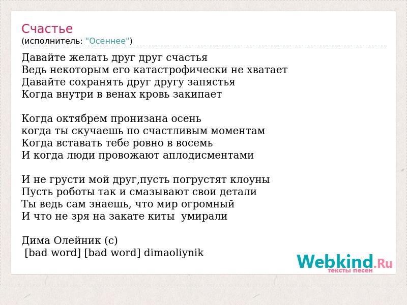 Давайте желать друг друг счастья Ведь некоторым его катастрофически не хватает Давайте сохранять друг другу запястья Когда внутри в венах кровь закипает Когда октябрем пронизана осень когда ты скучаешь по счастливым моментам Когда вставать тебе ровно в восемь И когда люди провожают аплодисментами И не грусти мой друг,пусть погрустят клоуны Пусть роботы так и смазывают свои детали Ты ведь сам знаешь, что мир огромный И что не зря на закате киты умирали Дима Олейник (с) [bad word] [bad word] dimaoliynik