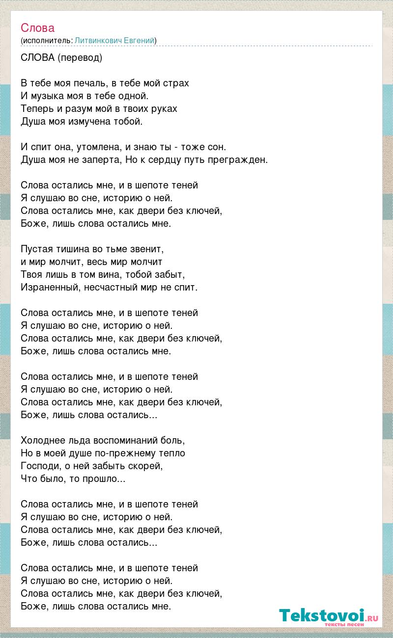 СЛОВА (перевод) В тебе моя печаль, в тебе мой страх И музыка моя в тебе одной. Теперь и разум мой в твоих руках Душа моя измучена тобой. И спит она, утомлена, и знаю ты - тоже сон. Душа моя не заперта, Но к сердцу путь прегражден. Слова остались мне, и в шепоте теней Я слушаю во сне, историю о ней. Слова остались мне, как двери без ключей, Боже, лишь слова остались мне. Пустая тишина во тьме звенит, и мир молчит, весь мир молчит Твоя лишь в том вина, тобой забыт, Израненный, несчастный мир не спит. Слова остались мне, и в шепоте теней Я слушаю во сне, историю о ней. Слова остались мне, как двери без ключей, Боже, лишь слова остались мне. Слова остались мне, и в шепоте теней Я слушаю во сне, историю о ней. Слова остались мне, как двери без ключей, Боже, лишь слова остались... Холоднее льда воспоминаний боль, Но в моей душе по-прежнему тепло Господи, о ней забыть скорей, Что было, то прошло... Слова остались мне, и в шепоте теней Я слушаю во сне, историю о ней. Слова остались мне, как двери без ключей, Боже, лишь слова остались... Слова остались мне, и в шепоте теней Я слушаю во сне, историю о ней. Слова остались мне, как двери без ключей, Боже, лишь слова остались мне.