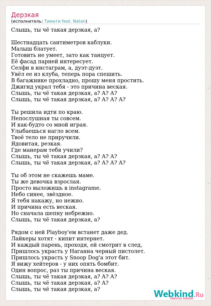 Слышь, ты чё такая дерзкая, а? Шестнадцать сантиметров каблуки. Малыш блатует. Готовить не умеет, зато как танцует. Её фасад парней интересует. Селфи в инстаграм, а, дуэт-дуэт. Увёл ее из клуба, теперь пора спешить. В багажнике прохладно, прошу меня простить. Джигид украл тебя - это причина веская. Слышь, ты чё такая дерзкая, а? А? А? Слышь, ты чё такая дерзкая, а? А? А? А? Ты решила идти по краю. Непослушная ты совсем. И как-будто со мной играя. Улыбаешься нагло всем. Твоё тело не приручили. Ядовитая, резкая. Где манерам тебя учили? Слышь, ты чё такая дерзкая, а? А? А? Слышь, ты чё такая дерзкая, а? А? А? А? Ты об этом не скажешь маме. Ты же девочка взрослая. Просто выложишь в instagramе. Небо синее, звёздное. Я тебя накажу, но нежно. И причина есть веская. Но сначала шепну небрежно. Слышь, ты чё такая дерзкая, а? Рядом с ней Plаyboy'ем встанет даже дед. Лайкеры хотят - кипит интернет. И каждый парень, проходя, ей смотрит в след, Пришлось украсть у Наганна черный пистолет. Пришлось украсть у Snoop Dog'а этот бит. Я вижу хейтеров - у них опять бомбит. Один вопрос, раз ты причина веская. Слышь, ты чё такая дерзкая, а? А? А? Слышь, ты чё такая дерзкая, а? А? Слышь, ты чё такая дерзкая, а?