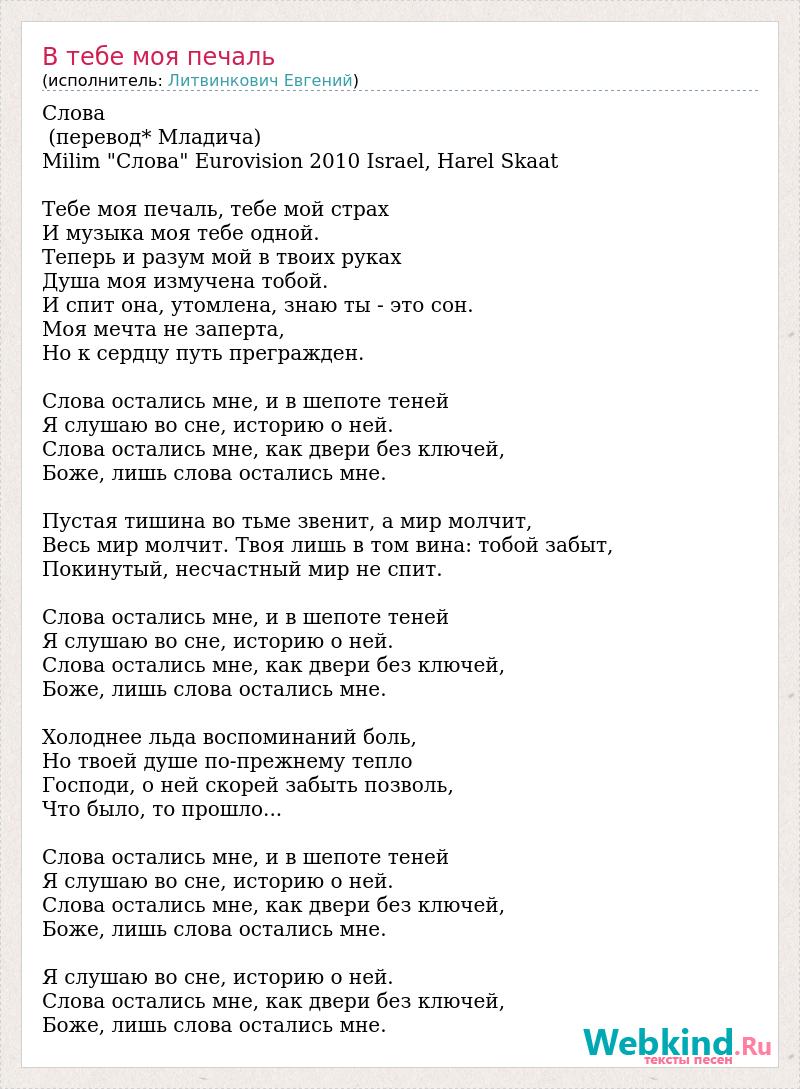 Слова (перевод* Младича) Milim "Слова" Eurovision 2010 Israel, Harel Skaat Тебе моя печаль, тебе мой страх И музыка моя тебе одной. Теперь и разум мой в твоих руках Душа моя измучена тобой. И спит она, утомлена, знаю ты - это сон. Моя мечта не заперта, Но к сердцу путь прегражден. Слова остались мне, и в шепоте теней Я слушаю во сне, историю о ней. Слова остались мне, как двери без ключей, Боже, лишь слова остались мне. Пустая тишина во тьме звенит, а мир молчит, Весь мир молчит. Твоя лишь в том вина: тобой забыт, Покинутый, несчастный мир не спит. Слова остались мне, и в шепоте теней Я слушаю во сне, историю о ней. Слова остались мне, как двери без ключей, Боже, лишь слова остались мне. Холоднее льда воспоминаний боль, Но твоей душе по-прежнему тепло Господи, о ней скорей забыть позволь, Что было, то прошло... Слова остались мне, и в шепоте теней Я слушаю во сне, историю о ней. Слова остались мне, как двери без ключей, Боже, лишь слова остались мне. Я слушаю во сне, историю о ней. Слова остались мне, как двери без ключей, Боже, лишь слова остались мне.
