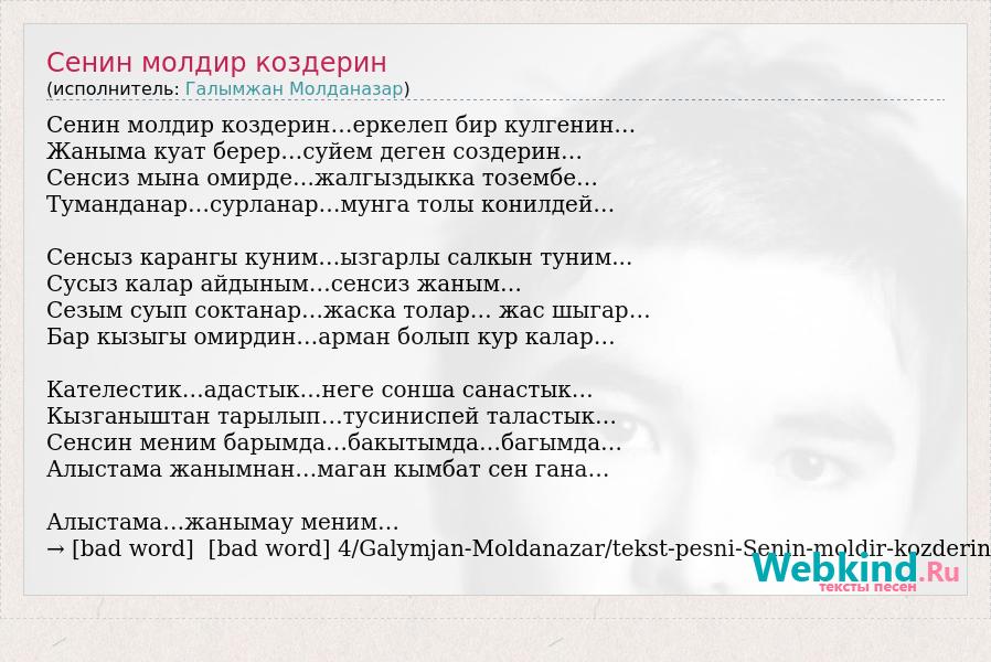 Сенин молдир коздерин…еркелеп бир кулгенин… Жаныма куат берер…суйем деген создерин… Сенсиз мына омирде…жалгыздыкка тозембе… Туманданар…сурланар…мунга толы конилдей… Сенсыз карангы куним…ызгарлы салкын туним... Сусыз калар айдыным…сенсиз жаным… Сезым суып соктанар…жаска толар… жас шыгар… Бар кызыгы омирдин…арман болып кур калар… Кателестик…адастык…неге сонша санастык… Кызганыштан тарылып…тусиниспей таластык… Сенсин меним барымда…бакытымда…багымда… Алыстама жанымнан…маган кымбат сен гана… Алыстама…жанымау меним… → [bad word] [bad word] 4/Galymjan-Moldanazar/tekst-pesni-Senin-moldir-kozderin