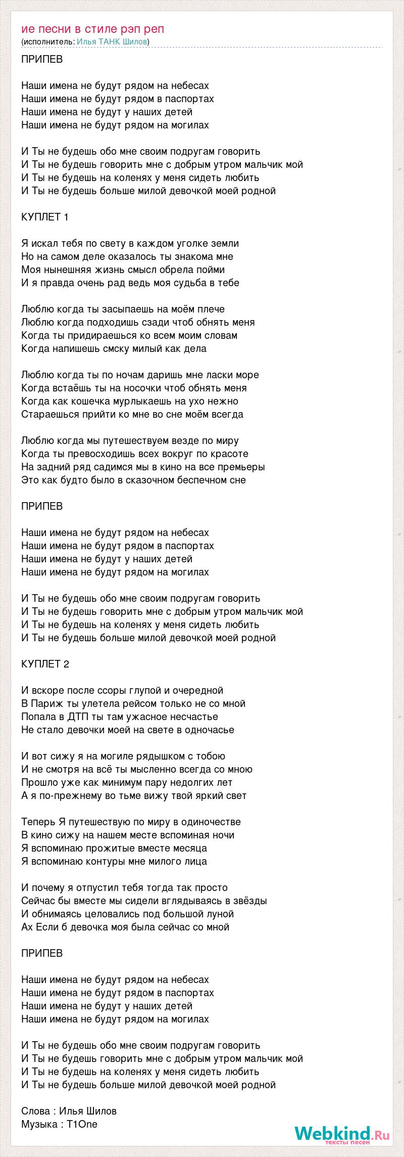 ПРИПЕВ Наши имена не будут рядом на небесах Наши имена не будут рядом в паспортах Наши имена не будут у наших детей Наши имена не будут рядом на могилах И Ты не будешь обо мне своим подругам говорить И Ты не будешь говорить мне с добрым утром мальчик мой И Ты не будешь на коленях у меня сидеть любить И Ты не будешь больше милой девочкой моей родной КУПЛЕТ 1 Я искал тебя по свету в каждом уголке земли Но на самом деле оказалось ты знакома мне Моя нынешняя жизнь смысл обрела пойми И я правда очень рад ведь моя судьба в тебе Люблю когда ты засыпаешь на моём плече Люблю когда подходишь сзади чтоб обнять меня Когда ты придираешься ко всем моим словам Когда напишешь смску милый как дела Люблю когда ты по ночам даришь мне ласки море Когда встаёшь ты на носочки чтоб обнять меня Когда как кошечка мурлыкаешь на ухо нежно Стараешься прийти ко мне во сне моём всегда Люблю когда мы путешествуем везде по миру Когда ты превосходишь всех вокруг по красоте На задний ряд садимся мы в кино на все премьеры Это как будто было в сказочном беспечном сне ПРИПЕВ Наши имена не будут рядом на небесах Наши имена не будут рядом в паспортах Наши имена не будут у наших детей Наши имена не будут рядом на могилах И Ты не будешь обо мне своим подругам говорить И Ты не будешь говорить мне с добрым утром мальчик мой И Ты не будешь на коленях у меня сидеть любить И Ты не будешь больше милой девочкой моей родной КУПЛЕТ 2 И вскоре после ссоры глупой и очередной В Париж ты улетела рейсом только не со мной Попала в ДТП ты там ужасное несчастье Не стало девочки моей на свете в одночасье И вот сижу я на могиле рядышком с тобою И не смотря на всё ты мысленно всегда со мною Прошло уже как минимум пару недолгих лет А я по-прежнему во тьме вижу твой яркий свет Теперь Я путешествую по миру в одиночестве В кино сижу на нашем месте вспоминая ночи Я вспоминаю прожитые вместе месяца Я вспоминаю контуры мне милого лица И почему я отпустил тебя тогда так просто Сейчас бы вместе мы сидели вглядываясь в звёзды И обнимаясь целовались под большой луной Ах Если б девочка моя была сейчас со мной ПРИПЕВ Наши имена не будут рядом на небесах Наши имена не будут рядом в паспортах Наши имена не будут у наших детей Наши имена не будут рядом на могилах И Ты не будешь обо мне своим подругам говорить И Ты не будешь говорить мне с добрым утром мальчик мой И Ты не будешь на коленях у меня сидеть любить И Ты не будешь больше милой девочкой моей родной Слова : Илья Шилов Музыка : T1One