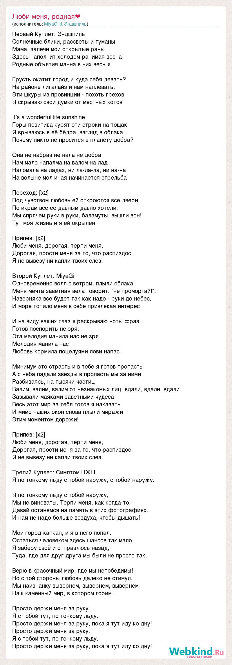 Первый Куплет: Эндшпиль Солнечные блики, рассветы и туманы Мама, залечи мои открытые раны Здесь наполнит холодом ранимая весна Родные объятия манна в них весь я. Грусть окатит город и куда себя девать? На районе лигалайз и нам наплевать. Эти шкуры из провинции - похоть грехов Я скрываю свои думки от местных котов It’s a wonderful life sunshine Горы позитива курят эти строки на тощак Я врываюсь в её бёдра, взгляд в облака, Почему никто не просится в планету добра? Она не набрав не нала не добра Нам мало напалма на валом на лад Наломала на ладах, ни ла-ла-ла, ни на-на На волыне мол иная начинается стрельба Переход: [х2] Под чувством любовь ей откроются все двери, По икрам все ее давным давно хотели. Мы спрячем руки в руки, баламуты, вышли вон! Тут моя жизнь и я ей окрылён Припев: [х2] Люби меня, дорогая, терпи меня, Дорогая, прости меня за то, что распиздос Я не вывезу ни капли твоих слез. Второй Куплет: MiyaGi Одновременно воля с ветром, плыли облака, Меня мечта заветная вела говорит: "не проморгай!". Наверняка все будет так как надо - руки до небес, И море топило меня в себе привлекая интерес И на виду ваших глаз я раскрываю ноты фраз Готов поспорить не зря. Эта мелодия манила нас не зря Мелодия манила нас Любовь кормила поцелуями лови напас Минимум это страсть и в тебе я готов пропасть А с неба падали звезды в пропасть мы за ними Разбиваясь, на тысячи частиц Валим, валим, валим от незнакомых лиц, вдали, вдали, вдали. Зазывали маяками заветными чудеса Весь этот мир за тебя готов я наказать И мимо наших окон снова плыли миражи Этим моментом дорожи! Припев: [х2] Люби меня, дорогая, терпи меня, Дорогая, прости меня за то, что распиздос Я не вывезу ни капли твоих слез. Третий Куплет: Симптом НЖН Я по тонкому льду с тобой наружу, с тобой наружу. Я по тонкому льду с тобой наружу, Мы не виноваты. Терпи меня, как когда-то. Давай останемся на память в этих фотографиях. И нам не надо больше воздуха, чтобы дышать! Мой город-капкан, и я в него попал. Остаться человеком здесь шансов так мало. Я заберу своё и отправлюсь назад, Туда, где для друг друга мы были не просто так. Верю в красочный мир, где мы непобедимы! Но с той стороны любовь далеко не стимул. Мы наизнанку вывернем, вывернем, вывернем Наш каменный мир, в котором горим... Просто держи меня за руку. Я с тобой тут, по тонкому льду. Просто держи меня за руку, пока я тут иду ко дну! Просто держи меня за руку. Я с тобой тут, по тонкому льду. Просто держи меня за руку, пока я тут иду ко дну!