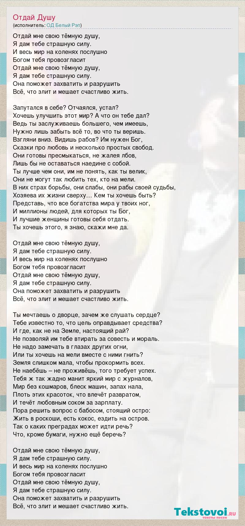 Отдай мне свою тёмную душу, Я дам тебе страшную силу. И весь мир на коленях послушно Богом тебя провозгласит Отдай мне свою тёмную душу, Я дам тебе страшную силу. Она поможет захватить и разрушить Всё, что злит и мешает счастливо жить. Запутался в себе? Отчаялся, устал? Хочешь улучшить этот мир? А что он тебе дал? Ведь ты заслуживаешь большего, чем имеешь, Нужно лишь забыть всё то, во что ты веришь. Взгляни вниз. Видишь рабов? Им нужен Бог, Сказки про любовь и несколько простых свобод. Они готовы пресмыкаться, не жалея лбов, Лишь бы не оставаться наедине с собой. Ты лучше чем они, им не понять, как ты велик, Они не могут так любить тех, кто на мели. В них страх борьбы, они слабы, они рабы своей судьбы, Хозяева их жизни сверху… Кем ты хочешь быть? Представь, что все богатства мира у твоих ног, И миллионы людей, для которых ты Бог, И лучшие женщины готовы себя отдать. Ты хочешь этого, я знаю, скажи мне да. Отдай мне свою тёмную душу, Я дам тебе страшную силу. И весь мир на коленях послушно Богом тебя провозгласит Отдай мне свою тёмную душу, Я дам тебе страшную силу. Она поможет захватить и разрушить Всё, что злит и мешает счастливо жить. Ты мечтаешь о дворце, зачем же слушать сердце? Тебе известно то, что цель оправдывает средства? И где, как не на Земле, настоящий рай? Не позволяй им тебе втирать за совесть и мораль. Не надо замечать в глазах других огни, Или ты хочешь на мели вместе с ними гнить? Земля слишком мала, чтобы прокормить всех. Не наебёшь – не проживёшь, того требует успех. Тебя ж так жадно манит яркий мир с журналов, Мир без кошмаров, блеск машин, запах нала, Плоть этих красоток, что влечёт развратом, И течёт любовным соком за зарплату. Пора решить вопрос с бабосом, стоящий остро: Жить в роскоши, есть кокос, ездить на остров. Так о каких преградах может идти речь? Что, кроме бумаги, нужно ещё беречь? Отдай мне свою тёмную душу, Я дам тебе страшную силу. И весь мир на коленях послушно Богом тебя провозгласит Отдай мне свою тёмную душу, Я дам тебе страшную силу. Она поможет захватить и разрушить Всё, что злит и мешает счастливо жить.
