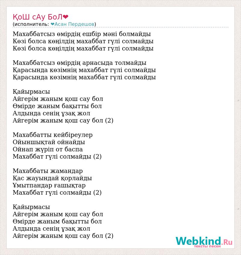 Махаббатсыз өмірдің ешбір мәні болмайды Көзі болса көңілдің махаббат гүлі солмайды Көзі болса көңілдің махаббат гүлі солмайды Махаббатсыз өмірдің арнасыда толмайды Қарасында көзімнің махаббат гүлі солмайды Қарасында көзімнің махаббат гүлі солмайды Қайырмасы Айгерім жаным қош сау бол Өмірде жаным бақытты бол Алдында сенің ұзақ жол Айгерім жаным қош сау бол (2) Махаббатты кейбіреулер Ойыншықтай ойнайды Ойнап жүріп от баспа Махаббат гүлі солмайды (2) Махаббаты жамандар Қас жауындай қорлайды Ұмытпандар ғашықтар Махаббат гүлі солмайды (2) Қайырмасы Айгерім жаным қош сау бол Өмірде жаным бақытты бол Алдында сенің ұзақ жол Айгерім жаным қош сау бол (2)