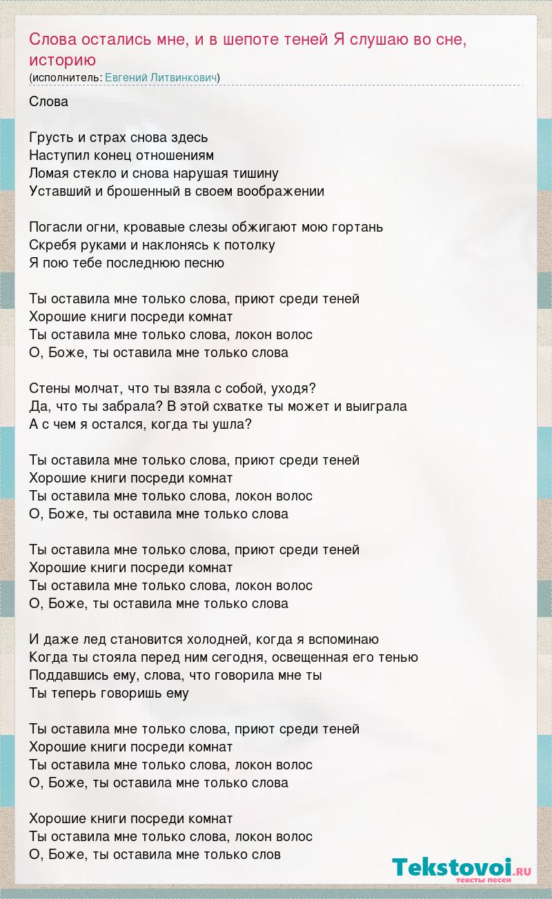 Главная→Исполнители→Евгений Литвинкович→Слова остались мне, и в шепоте теней Я слушаю во сне, историю о ней. Слова
