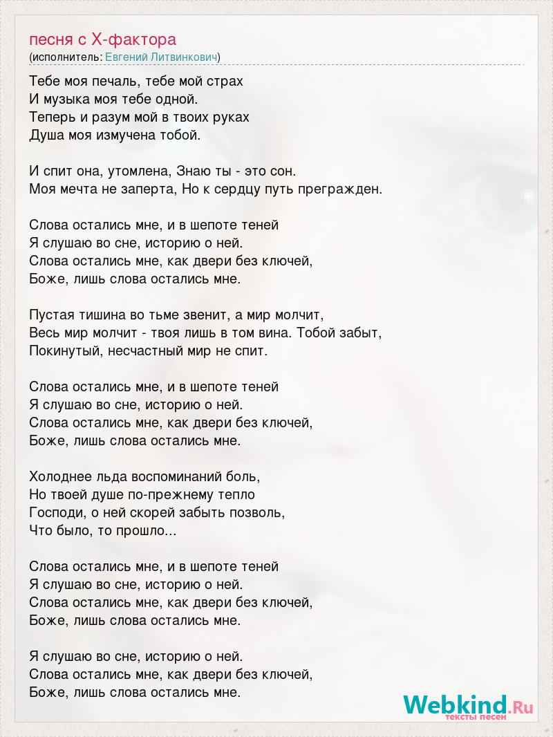 Тебе моя печаль, тебе мой страх И музыка моя тебе одной. Теперь и разум мой в твоих руках Душа моя измучена тобой. И спит она, утомлена, Знаю ты - это сон. Моя мечта не заперта, Но к сердцу путь прегражден. Слова остались мне, и в шепоте теней Я слушаю во сне, историю о ней. Слова остались мне, как двери без ключей, Боже, лишь слова остались мне. Пустая тишина во тьме звенит, а мир молчит, Весь мир молчит - твоя лишь в том вина. Тобой забыт, Покинутый, несчастный мир не спит. Слова остались мне, и в шепоте теней Я слушаю во сне, историю о ней. Слова остались мне, как двери без ключей, Боже, лишь слова остались мне. Холоднее льда воспоминаний боль, Но твоей душе по-прежнему тепло Господи, о ней скорей забыть позволь, Что было, то прошло... Слова остались мне, и в шепоте теней Я слушаю во сне, историю о ней. Слова остались мне, как двери без ключей, Боже, лишь слова остались мне. Я слушаю во сне, историю о ней. Слова остались мне, как двери без ключей, Боже, лишь слова остались мне.