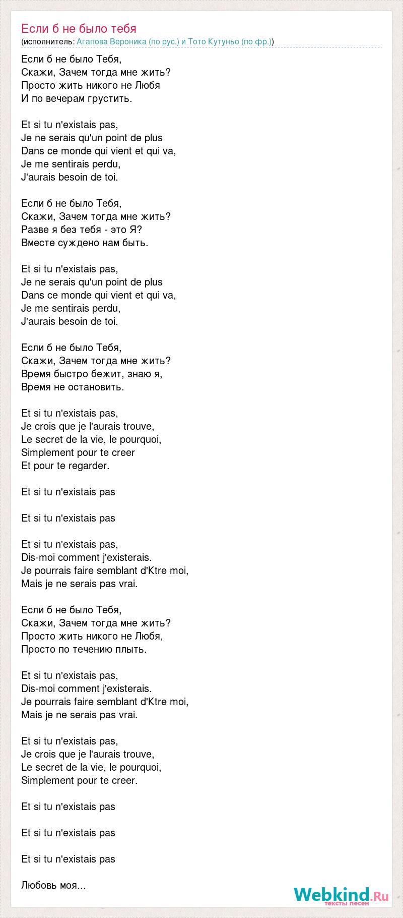 Если б не было Тебя, Скажи, Зачем тогда мне жить? Просто жить никого не Любя И по вечерам грустить. Et si tu n'existais pas, Je ne serais qu'un point de plus Dans ce monde qui vient et qui va, Je me sentirais perdu, J'aurais besoin de toi. Если б не было Тебя, Скажи, Зачем тогда мне жить? Разве я без тебя - это Я? Вместе суждено нам быть. Et si tu n'existais pas, Je ne serais qu'un point de plus Dans ce monde qui vient et qui va, Je me sentirais perdu, J'aurais besoin de toi. Если б не было Тебя, Скажи, Зачем тогда мне жить? Время быстро бежит, знаю я, Время не остановить. Et si tu n'existais pas, Je crois que je l'aurais trouve, Le secret de la vie, le pourquoi, Simplement pour te creer Et pour te regarder. Et si tu n'existais pas Et si tu n'existais pas Et si tu n'existais pas, Dis-moi comment j'existerais. Je pourrais faire semblant d'Кtre moi, Mais je ne serais pas vrai. Если б не было Тебя, Скажи, Зачем тогда мне жить? Просто жить никого не Любя, Просто по течению плыть. Et si tu n'existais pas, Dis-moi comment j'existerais. Je pourrais faire semblant d'Кtre moi, Mais je ne serais pas vrai. Et si tu n'existais pas, Je crois que je l'aurais trouve, Le secret de la vie, le pourquoi, Simplement pour te creer. Et si tu n'existais pas Et si tu n'existais pas Et si tu n'existais pas Любовь моя...