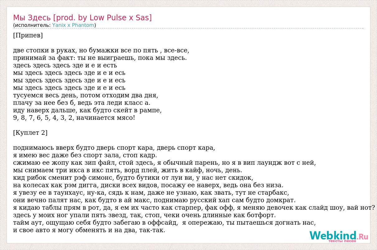 [Припев] две стопки в руках, но бумажки все по пять , все-все, принимай за факт: ты не выиграешь, пока мы здесь. здесь здесь здесь зде и е и есть мы здесь здесь здесь зде и е и есь мы здесь здесь здесь зде и е и есь мы здесь здесь здесь зде и е и есь тусуемся весь день, потом отходим два дня, плачу за нее без б, ведь эта леди класс а. иду наверх дальше, как будто скейт в рампе, 9, 8, 7, 6, 5, 4, 3, 2, начинается мясо! [Куплет 2] поднимаюсь вверх будто дверь спорт кара, дверь спорт кара, я имею вес даже без спорт зала, стоп кадр. сжимаю ее жопу как зип файл, стой здесь, я обычный парень, но я в вип лаундж вот с ней, мы снимаем три икса в икс пять, ворд плей, жить в кайф, ночь, день. кид рибок сменит рэф симонс, будто бутики от луи ви, у нас нет скидок, на колесах как рэм дигга, диски всех видов, посажу ее наверх, ведь она без низа. я увезу ее в таунхаус, ну-ка, сядь к нам, даже не узнаю, как звать, тут не старбакс, они вечно палят нас, как будто в ай макс, поднимаю русский хап сам будто домкрат. я кидаю таблы прям в рот, да, я ем их часто как старпер, фак офф, я меняю девочек как слайд шоу, вай нот? здесь у моих ног упали пять звезд, так, стоп, чеки очень длинные как ботфорт. тайм аут, ощущаю себя будто забегаю в оффсайд, я опережаю, ты пытаешься догнать нас, и свое авто я могу обменять и на два, так-так.
