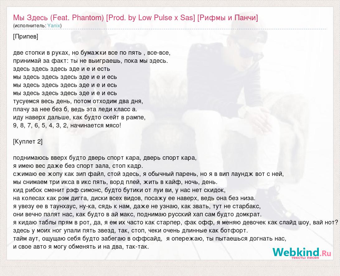 [Припев] две стопки в руках, но бумажки все по пять , все-все, принимай за факт: ты не выиграешь, пока мы здесь. здесь здесь здесь зде и е и есть мы здесь здесь здесь зде и е и есь мы здесь здесь здесь зде и е и есь мы здесь здесь здесь зде и е и есь тусуемся весь день, потом отходим два дня, плачу за нее без б, ведь эта леди класс а. иду наверх дальше, как будто скейт в рампе, 9, 8, 7, 6, 5, 4, 3, 2, начинается мясо! [Куплет 2] поднимаюсь вверх будто дверь спорт кара, дверь спорт кара, я имею вес даже без спорт зала, стоп кадр. сжимаю ее жопу как зип файл, стой здесь, я обычный парень, но я в вип лаундж вот с ней, мы снимаем три икса в икс пять, ворд плей, жить в кайф, ночь, день. кид рибок сменит рэф симонс, будто бутики от луи ви, у нас нет скидок, на колесах как рэм дигга, диски всех видов, посажу ее наверх, ведь она без низа. я увезу ее в таунхаус, ну-ка, сядь к нам, даже не узнаю, как звать, тут не старбакс, они вечно палят нас, как будто в ай макс, поднимаю русский хап сам будто домкрат. я кидаю таблы прям в рот, да, я ем их часто как старпер, фак офф, я меняю девочек как слайд шоу, вай нот? здесь у моих ног упали пять звезд, так, стоп, чеки очень длинные как ботфорт. тайм аут, ощущаю себя будто забегаю в оффсайд, я опережаю, ты пытаешься догнать нас, и свое авто я могу обменять и на два, так-так.