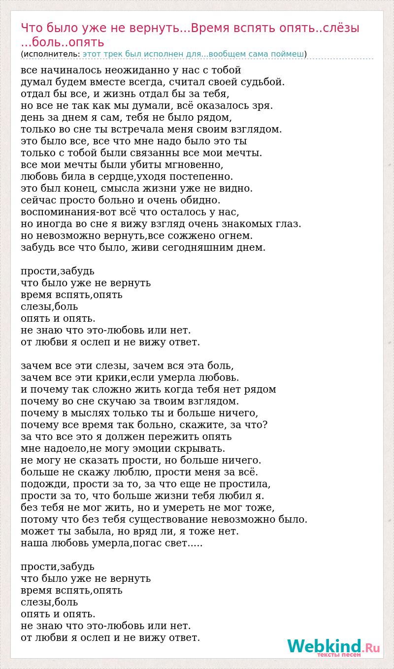 все начиналось неожиданно у нас с тобой думал будем вместе всегда, считал своей судьбой. отдал бы все, и жизнь отдал бы за тебя, но все не так как мы думали, всё оказалось зря. день за днем я сам, тебя не было рядом, только во сне ты встречала меня своим взглядом. это было все, все что мне надо было это ты только с тобой были связанны все мои мечты. все мои мечты были убиты мгновенно, любовь била в сердце,уходя постепенно. это был конец, смысла жизни уже не видно. сейчас просто больно и очень обидно. воспоминания-вот всё что осталось у нас, но иногда во сне я вижу взгляд очень знакомых глаз. но невозможно вернуть,все сожжено огнем. забудь все что было, живи сегодняшним днем. прости,забудь что было уже не вернуть время вспять,опять слезы,боль опять и опять. не знаю что это-любовь или нет. от любви я ослеп и не вижу ответ. зачем все эти слезы, зачем вся эта боль, зачем все эти крики,если умерла любовь. и почему так сложно жить когда тебя нет рядом почему во сне скучаю за твоим взглядом. почему в мыслях только ты и больше ничего, почему все время так больно, скажите, за что? за что все это я должен пережить опять мне надоело,не могу эмоции скрывать. не могу не сказать прости, но больше ничего. больше не скажу люблю, прости меня за всё. подожди, прости за то, за что еще не простила, прости за то, что больше жизни тебя любил я. без тебя не мог жить, но и умереть не мог тоже, потому что без тебя существование невозможно было. может ты забыла, но вряд ли, я тоже нет. наша любовь умерла,погас свет..... прости,забудь что было уже не вернуть время вспять,опять слезы,боль опять и опять. не знаю что это-любовь или нет. от любви я ослеп и не вижу ответ.