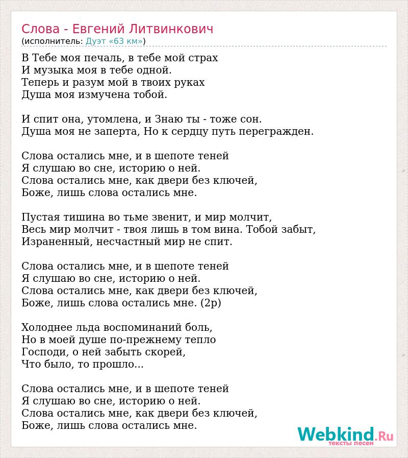 В Тебе моя печаль, в тебе мой страх И музыка моя в тебе одной. Теперь и разум мой в твоих руках Душа моя измучена тобой. И спит она, утомлена, и Знаю ты - тоже сон. Душа моя не заперта, Но к сердцу путь перегражден. Слова остались мне, и в шепоте теней Я слушаю во сне, историю о ней. Слова остались мне, как двери без ключей, Боже, лишь слова остались мне. Пустая тишина во тьме звенит, и мир молчит, Весь мир молчит - твоя лишь в том вина. Тобой забыт, Израненный, несчастный мир не спит. Слова остались мне, и в шепоте теней Я слушаю во сне, историю о ней. Слова остались мне, как двери без ключей, Боже, лишь слова остались мне. (2р) Холоднее льда воспоминаний боль, Но в моей душе по-прежнему тепло Господи, о ней забыть скорей, Что было, то прошло... Слова остались мне, и в шепоте теней Я слушаю во сне, историю о ней. Слова остались мне, как двери без ключей, Боже, лишь слова остались мне.