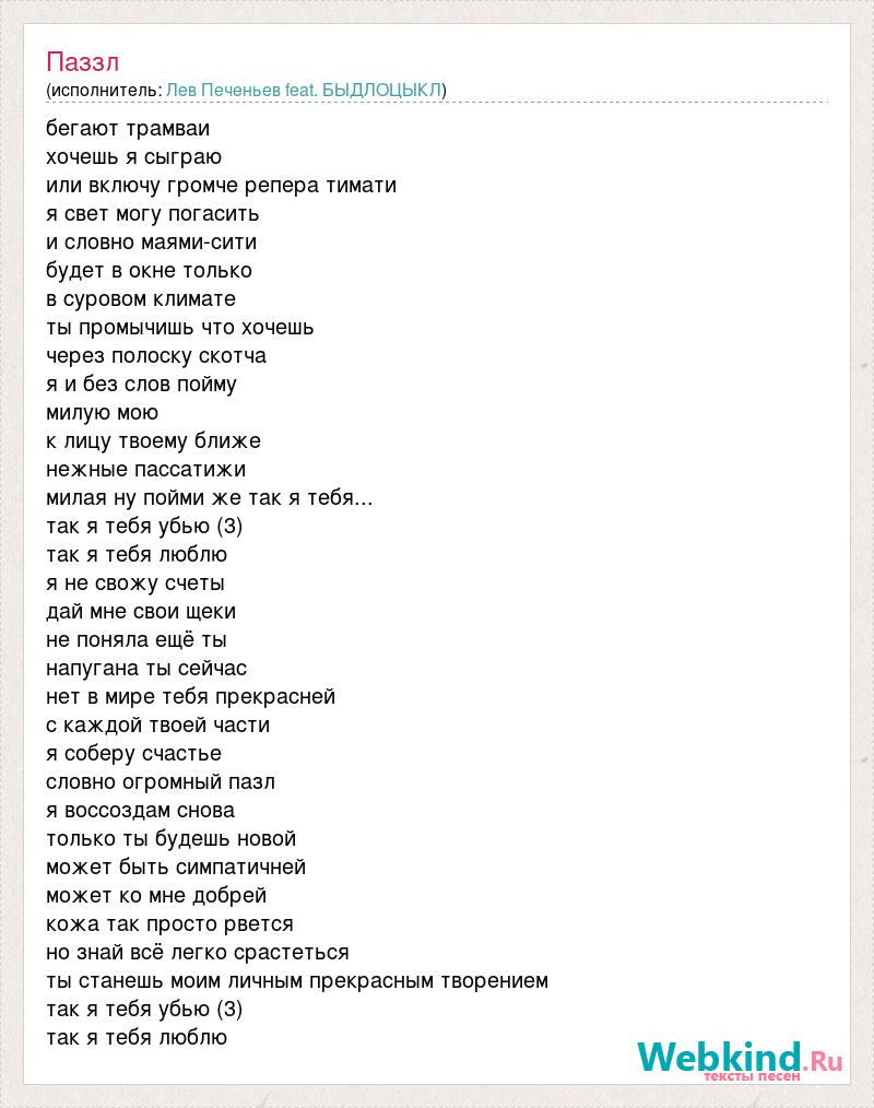 бегают трамваи хочешь я сыграю или включу громче репера тимати я свет могу погасить и словно маями-сити будет в окне только в суровом климате ты промычишь что хочешь через полоску скотча я и без слов пойму милую мою к лицу твоему ближе нежные пассатижи милая ну пойми же так я тебя... так я тебя убью (3) так я тебя люблю я не свожу счеты дай мне свои щеки не поняла ещё ты напугана ты сейчас нет в мире тебя прекрасней с каждой твоей части я соберу счастье словно огромный пазл я воссоздам снова только ты будешь новой может быть симпатичней может ко мне добрей кожа так просто рвется но знай всё легко срастеться ты станешь моим личным прекрасным творением так я тебя убью (3) так я тебя люблю