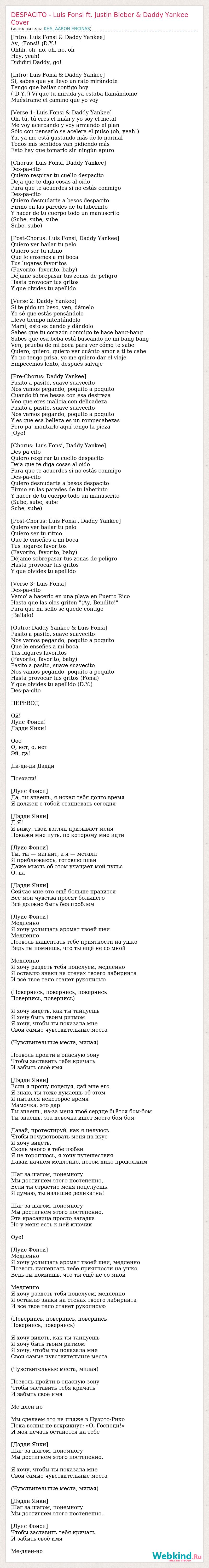 [Intro: Luis Fonsi & Daddy Yankee] Ay, ¡Fonsi! ¡D.Y.! Ohhh, oh, no, oh, no, oh Hey, yeah! Dididiri Daddy, go! [Intro: Luis Fonsi & Daddy Yankee] Sí, sabes que ya llevo un rato mirándote Tengo que bailar contigo hoy (¡D.Y.!) Vi que tu mirada ya estaba llamándome Muéstrame el camino que yo voy [Verse 1: Luis Fonsi & Daddy Yankee] Oh, tú, tú eres el imán y yo soy el metal Me voy acercando y voy armando el plan Sólo con pensarlo se acelera el pulso (oh, yeah!) Ya, ya me está gustando más de lo normal Todos mis sentidos van pidiendo más Esto hay que tomarlo sin ningún apuro [Chorus: Luis Fonsi, Daddy Yankee] Des-pa-cito Quiero respirar tu cuello despacito Deja que te diga cosas al oído Para que te acuerdes si no estás conmigo Des-pa-cito Quiero desnudarte a besos despacito Firmo en las paredes de tu laberinto Y hacer de tu cuerpo todo un manuscrito (Sube, sube, sube Sube, sube) [Post-Chorus: Luis Fonsi, Daddy Yankee] Quiero ver bailar tu pelo Quiero ser tu ritmo Que le enseñes a mi boca Tus lugares favoritos (Favorito, favorito, baby) Déjame sobrepasar tus zonas de peligro Hasta provocar tus gritos Y que olvides tu apellido [Verse 2: Daddy Yankee] Si te pido un beso, ven, dámelo Yo sé que estás pensándolo Llevo tiempo intentándolo Mami, esto es dando y dándolo Sabes que tu corazón conmigo te hace bang-bang Sabes que esa beba está buscando de mi bang-bang Ven, prueba de mi boca para ver cómo te sabe Quiero, quiero, quiero ver cuánto amor a ti te cabe Yo no tengo prisa, yo me quiero dar el viaje Empecemos lento, después salvaje [Pre-Chorus: Daddy Yankee] Pasito a pasito, suave suavecito Nos vamos pegando, poquito a poquito Cuando tú me besas con esa destreza Veo que eres malicia con delicadeza Pasito a pasito, suave suavecito Nos vamos pegando, poquito a poquito Y es que esa belleza es un rompecabezas Pero pa' montarlo aquí tengo la pieza ¡Oye! [Chorus: Luis Fonsi, Daddy Yankee] Des-pa-cito Quiero respirar tu cuello despacito Deja que te diga cosas al oído Para que te acuerdes si no estás conmigo Des-pa-cito Quiero desnudarte a besos despacito Firmo en las paredes de tu laberinto Y hacer de tu cuerpo todo un manuscrito (Sube, sube, sube Sube, sube) [Post-Chorus: Luis Fonsi , Daddy Yankee] Quiero ver bailar tu pelo Quiero ser tu ritmo Que le enseñes a mi boca Tus lugares favoritos (Favorito, favorito, baby) Déjame sobrepasar tus zonas de peligro Hasta provocar tus gritos Y que olvides tu apellido [Verse 3: Luis Fonsi] Des-pa-cito Vamo' a hacerlo en una playa en Puerto Rico Hasta que las olas griten "¡Ay, Bendito!" Para que mi sello se quede contigo ¡Bailalo! [Outro: Daddy Yankee & Luis Fonsi] Pasito a pasito, suave suavecito Nos vamos pegando, poquito a poquito Que le enseñes a mi boca Tus lugares favoritos (Favorito, favorito, baby) Pasito a pasito, suave suavecito Nos vamos pegando, poquito a poquito Hasta provocar tus gritos (Fonsi) Y que olvides tu apellido (D.Y.) Des-pa-cito ПЕРЕВОД Ой! Луис Фонси! Дэдди Янки! Ооо О, нет, о, нет Эй, да! Ди-ди-ди Дэдди Поехали! [Луис Фонси] Да, ты знаешь, я искал тебя долго время Я должен с тобой станцевать сегодня [Дэдди Янки] Д.Я! Я вижу, твой взгляд призывает меня Покажи мне путь, по которому мне идти [Луис Фонси] Ты, ты — магнит, а я — металл Я приближаюсь, готовлю план Даже мысль об этом учащает мой пульс О, да [Дэдди Янки] Сейчас мне это ещё больше нравится Все мои чувства просят большего Всё должно быть без проблем [Луис Фонси] Медленно Я хочу услышать аромат твоей шеи Медленно Позволь нашептать тебе приятности на ушко Ведь ты помнишь, что ты ещё не со мной Медленно Я хочу раздеть тебя поцелуем, медленно Я оставлю знаки на стенах твоего лабиринта И всё твое тело станет рукописью (Повернись, повернись, повернись Повернись, повернись) Я хочу видеть, как ты танцуешь Я хочу быть твоим ритмом Я хочу, чтобы ты показала мне Свои самые чувствительные места (Чувствительные места, милая) Позволь пройти в опасную зону Чтобы заставить тебя кричать И забыть своё имя [Дэдди Янки] Если я прошу поцелуя, дай мне его Я знаю, ты тоже думаешь об этом Я пытался некоторое время Мамочка, это дар Ты знаешь, из-за меня твоё сердце бьётся бом-бом Ты знаешь, эта девочка ищет моего бом-бом Давай, протестируй, как я целуюсь Чтобы почувствовать меня на вкус Я хочу видеть, Сколь много в тебе любви Я не тороплюсь, я хочу путешествия Давай начнем медленно, потом дико продолжим Шаг за шагом, понемногу Мы достигнем этого постепенно, Если ты страстно меня поцелуешь. Я думаю, ты излишне деликатна! Шаг за шагом, понемногу Мы достигнем этого постепенно, Эта красавица просто загадка Но у меня есть к ней ключик Оуе! [Луис Фонси] Медлен